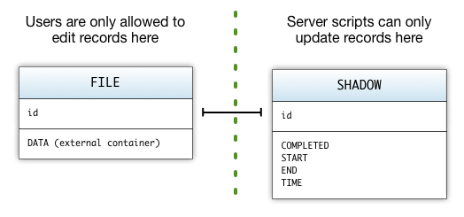 You need to make sure you create a SHADOW record every time you create a record in the FILE table. And turn on cascading delete so if you were to delete the FILE record it automatically deletes its twin in the SHADOW table without creating orphan records.