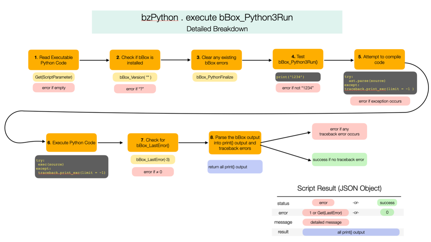 To see a detailed breakdown of the mechanics of compiling, executing, and parsing out the data and error results, see Appendix B: Anatomy of bzPython Code Execution