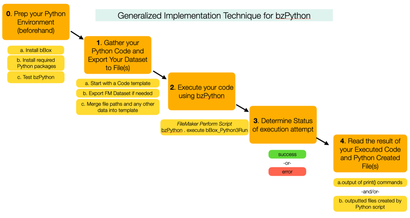 bzPython-FM provides an easily scripted method of performing Python code from the FileMaker scripting environment. All a FileMaker developer needs to do is create the Python code [or partner with another developer] then pass it to the module. bzPython-FM, using bBox, will then perform the code and return output from Python via print().