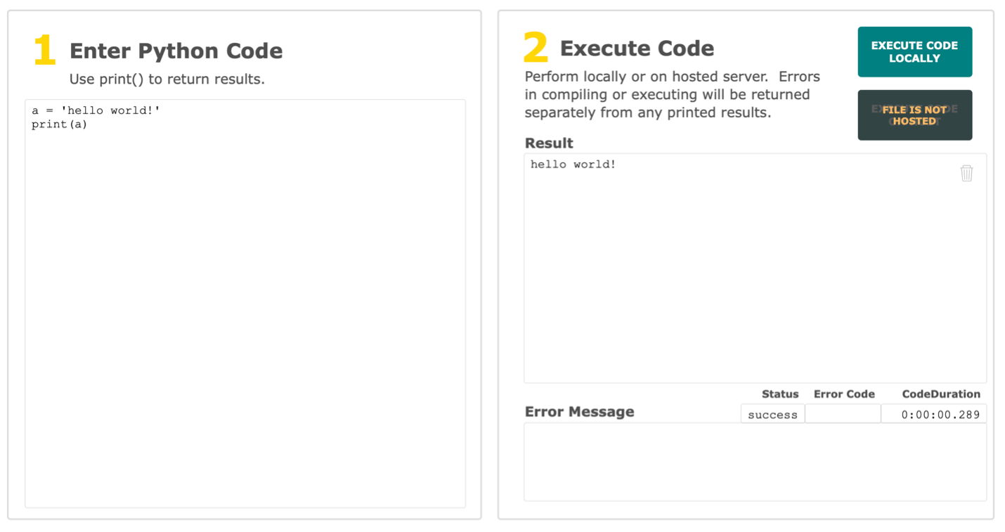The demo file contains a Workshop for testing your Python Code. In the ‘Workshop’ tab, simply enter your Python code on the left and click ‘Execute the Code’. The result of your print() commands will show in the result and any errors encountered below that. As well, duration of execution in seconds is tracked.