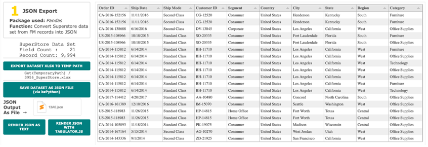 Simply put, this converts your exported xlsx into a JSON array and saves it back to FileMaker as a container field. Once the container field with JSON is populated, there are two buttons to display the JSON in a webviewer. One displays as pure JSON text, the other using a JS library called Tabulator.