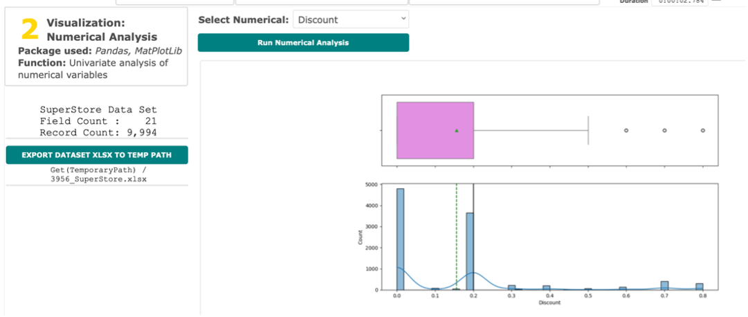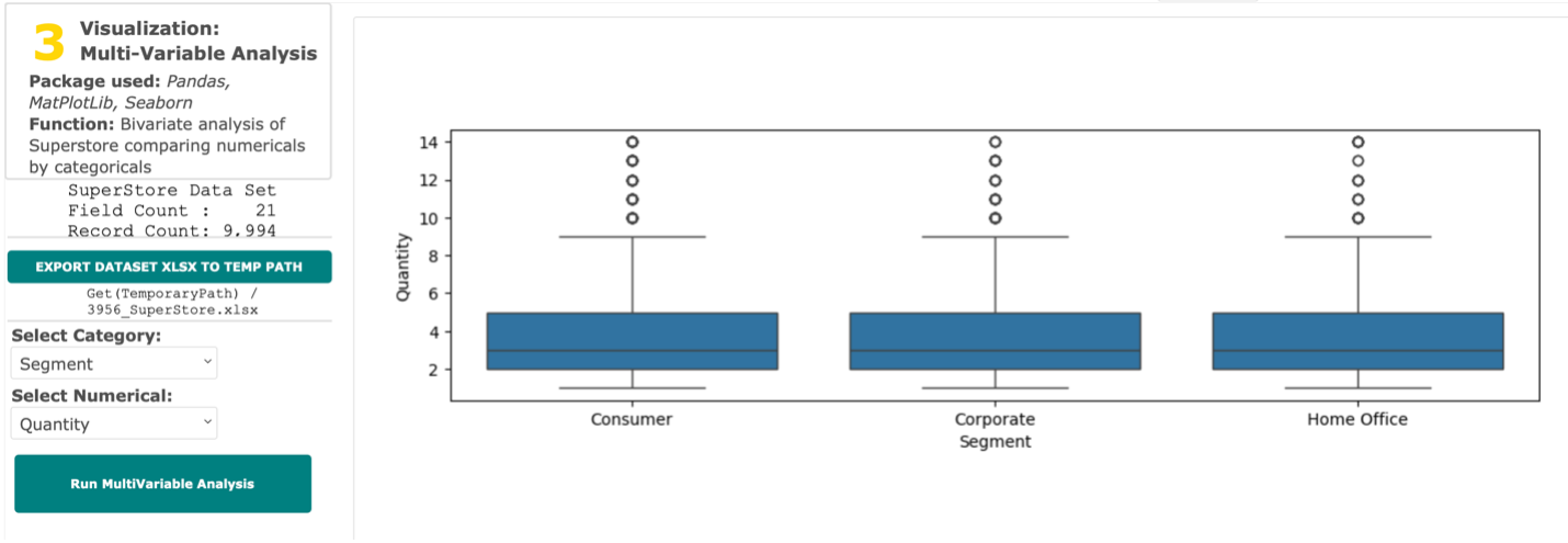 This demo does a simple box plot analysis one of the numerical variables in your dataset. This uses the pandas package to read the data and then the matplotlib and seaborn packages to visualize the data.