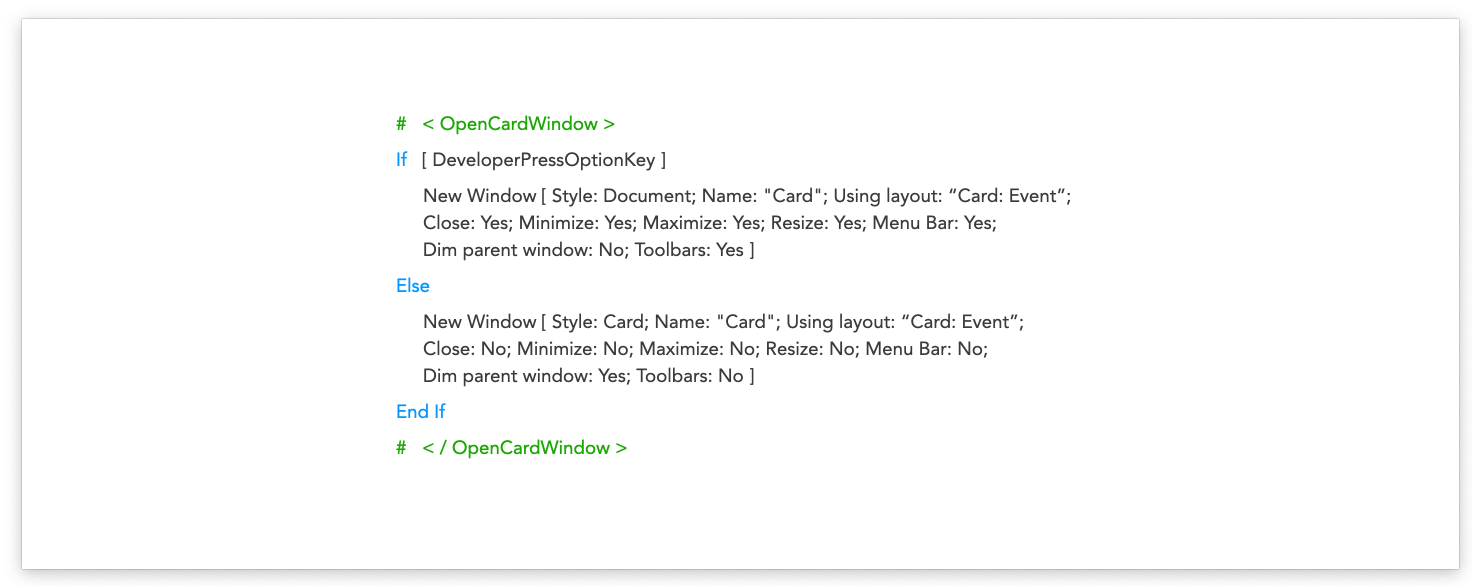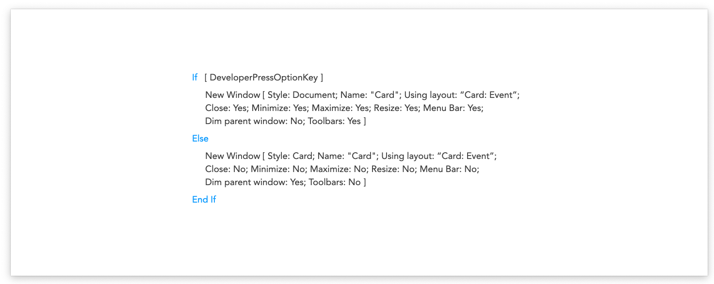 Solution: Set up an ‘if’ statement within your script to open a Card Window, where if the User has [Full Access] and the Option key is pressed, open a Document Window instead of a Card Window.
