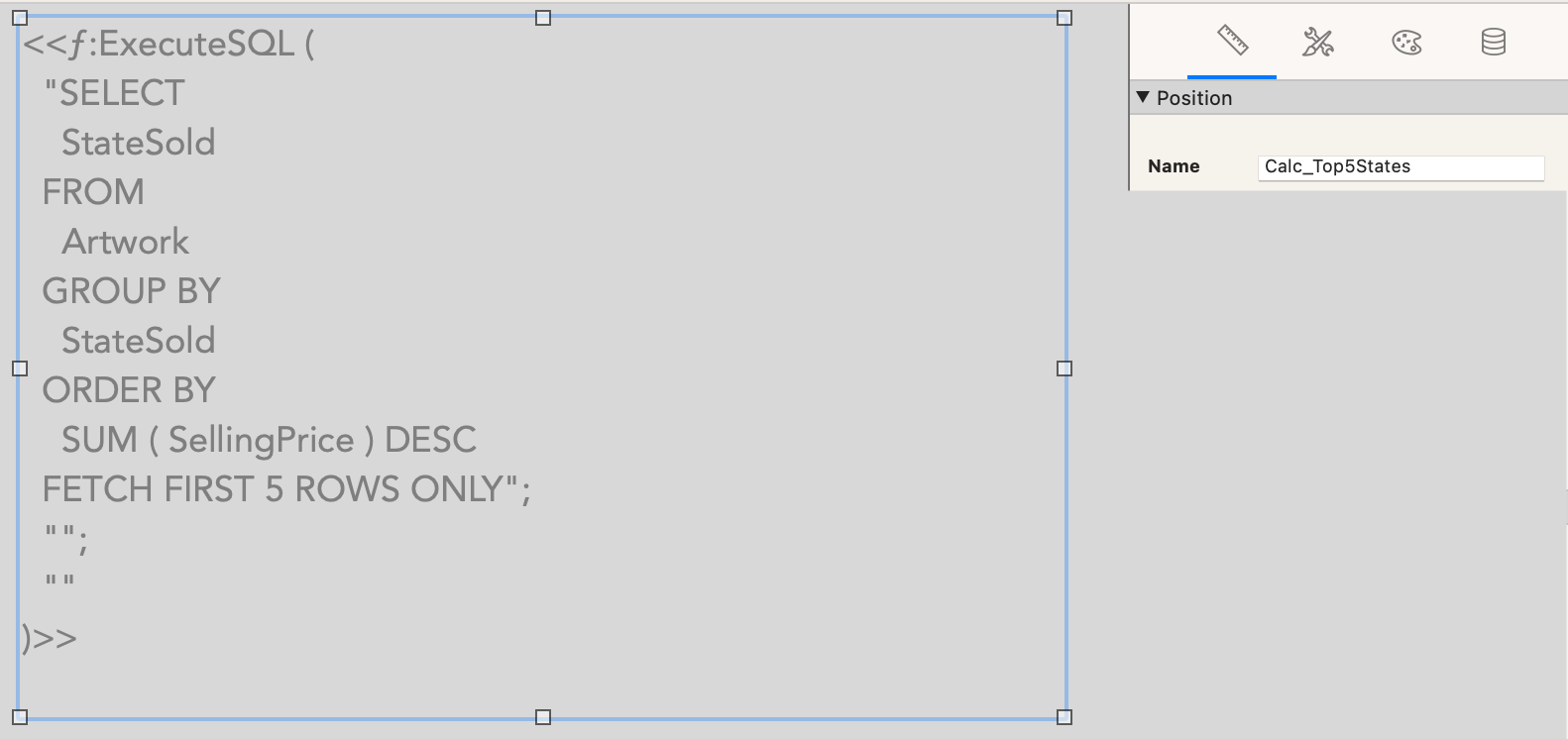 Source layout calculations can also improve performance of layouts that rely on ad hoc calculations. Imagine if we wanted to display the top 5 states for sales along the top of our layout on our layout. We can get the source data for this using a SQL query: