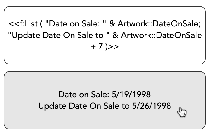 Here’s an example of button that adds 7 days to DateOnSale field while displaying the current date and the date if the button is pressed: