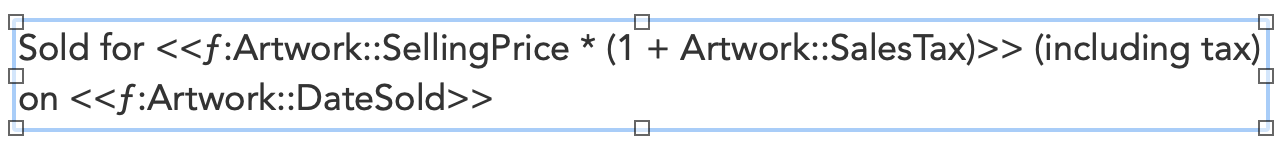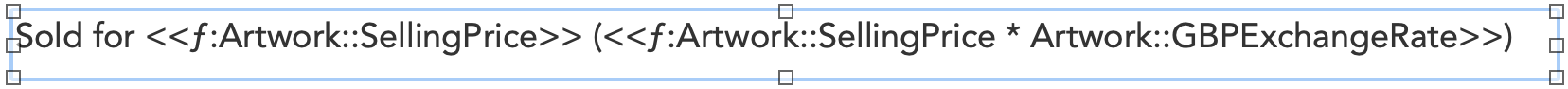 Our gallery system has specific requirements for date and number formatting. In particular we want to display a description of the sale that formats the selling price including tax with currency formatting and the date as a “longhand” date with day name and month name. This is possible if we break our text object down into multiple layout calculations that return a number and a date respectively. Doing this allows us to leverage the features of the Data Formatting pane.