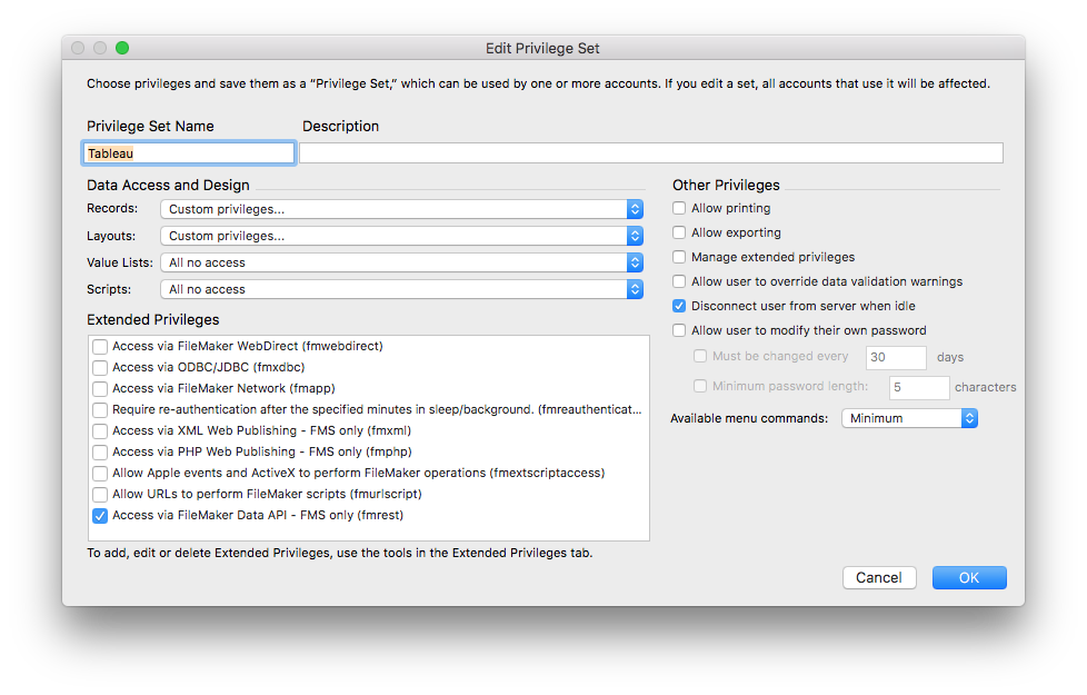 You could also use one of the default settings for allowing read-only access to all tables if you like but, I like being specific about what tables and layouts you are granting access to, especially if down the road you want to then continue to publish your data and people are subscribing to it with Tableau Server.