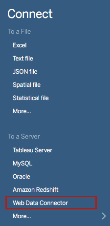 In Tableau, the URL that you enter for the Web Data Connector will look something like this: