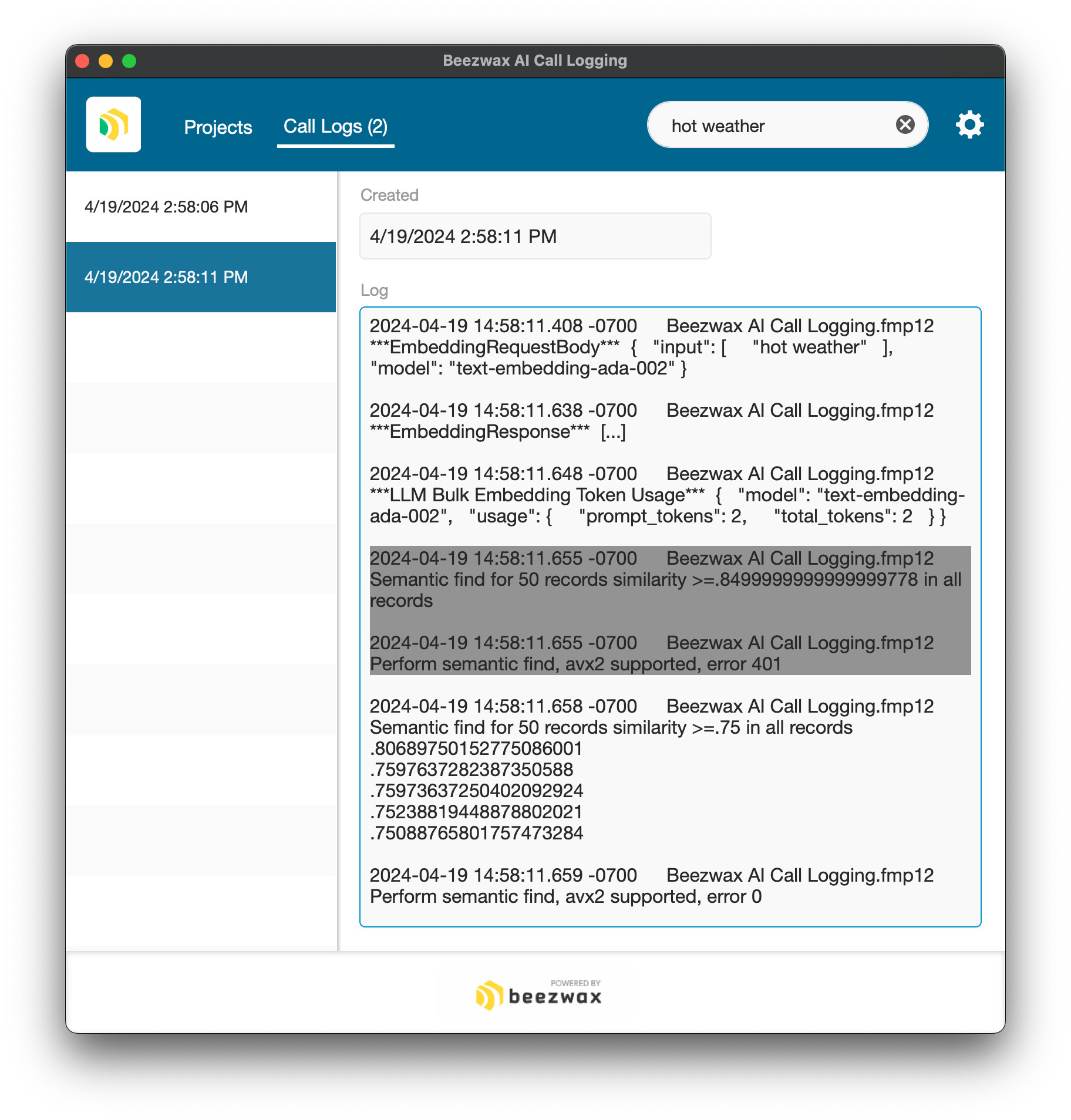 So what do you do with that information? In this example file, I extend the Perform Semantic Search demo file to include AI call logging.
