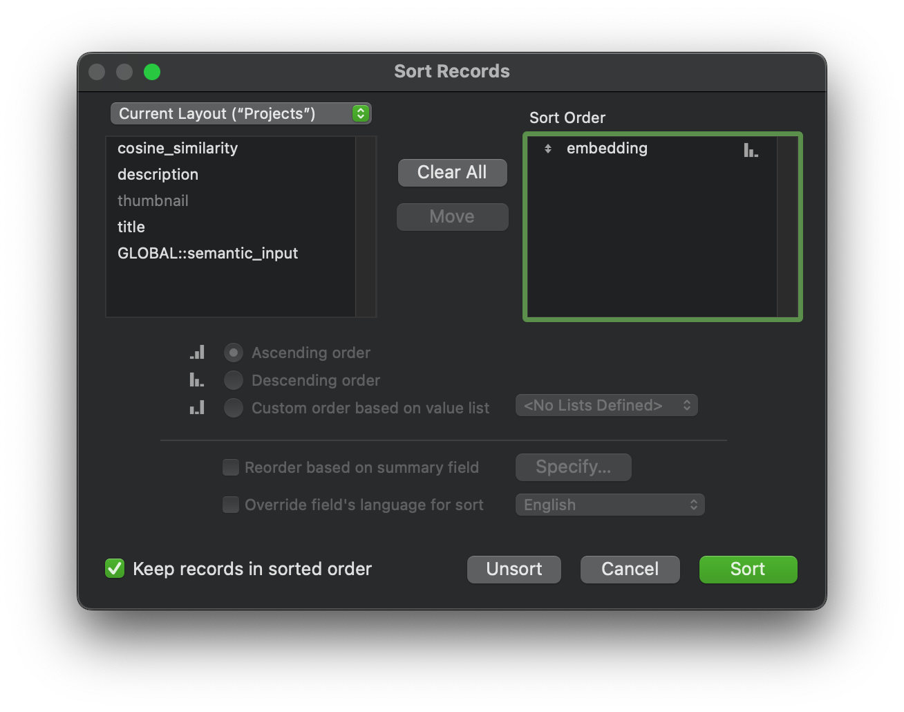 Remember: this embedding field is a container, and we can’t normally sort on container fields. It’s as if displaying the container field in the sort order is FileMaker’s way of saying “sorted by the cosine similarity of this embedding field and whatever embedding was used in the semantic find”.
