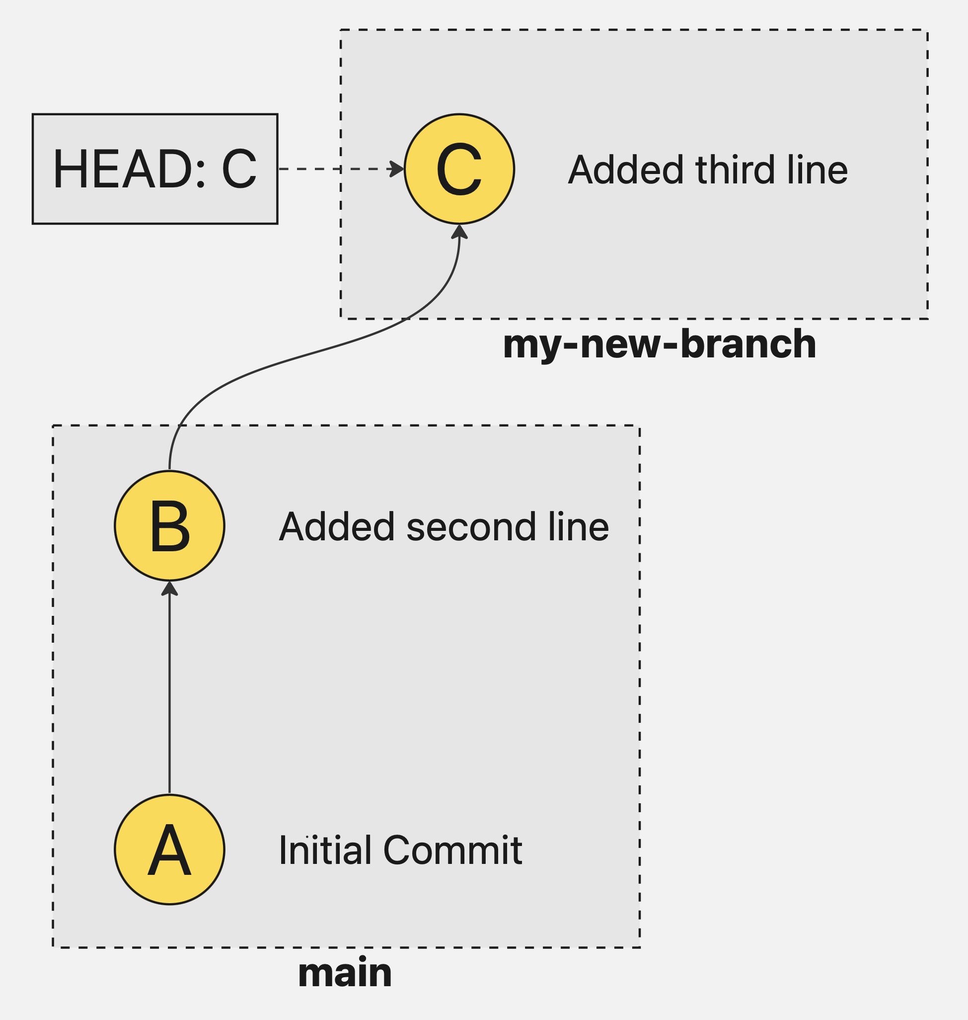 We are still looking at the latest commit, but instead of being in main, we are now in my-new-branch. This is our sandbox and here, we can create new commits, make all the changes we need, and we could even discard this branch and nothing will ever happen to main.