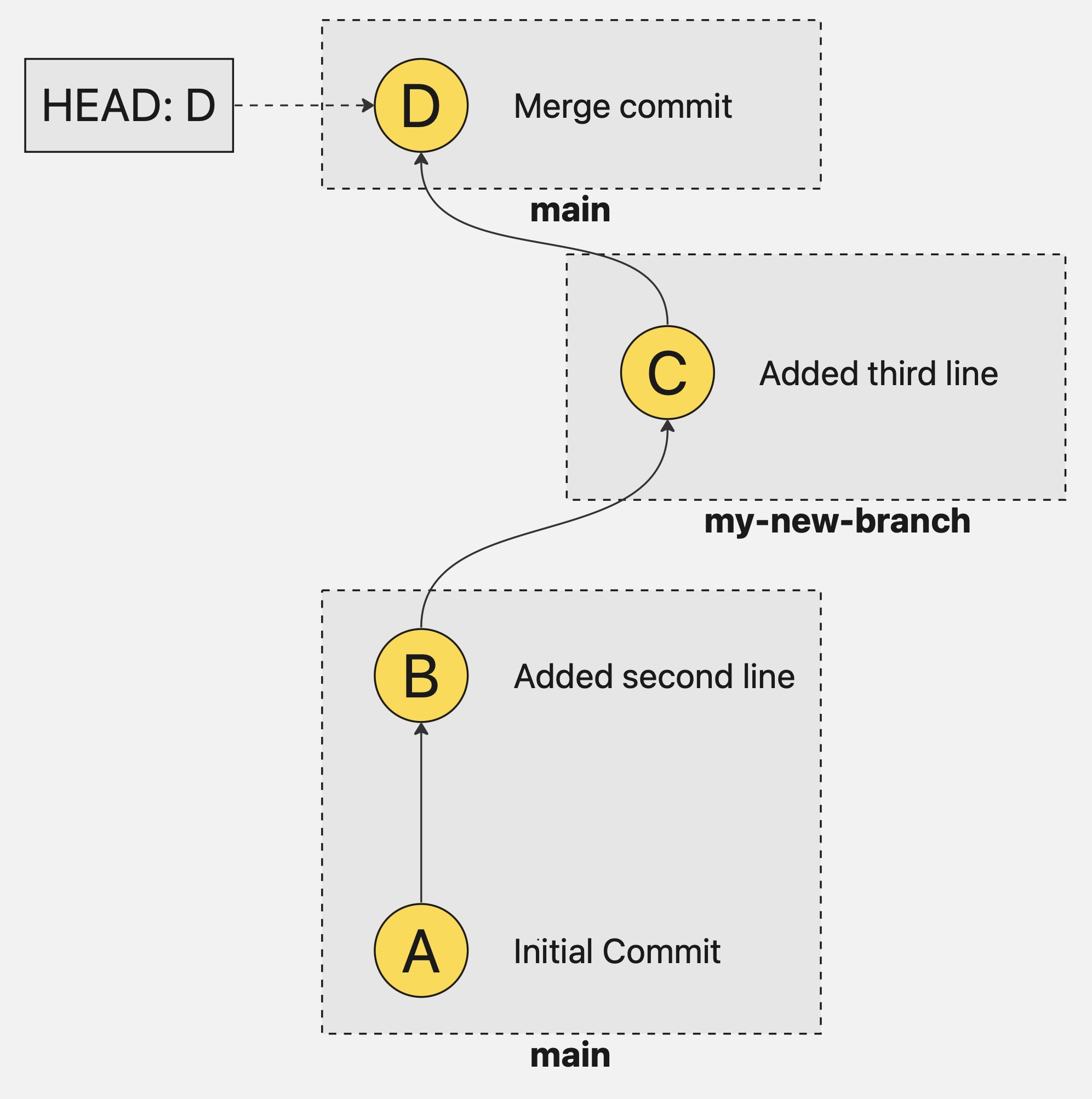 When merging two commits, git will normally create a new one, making our commit history look like this: