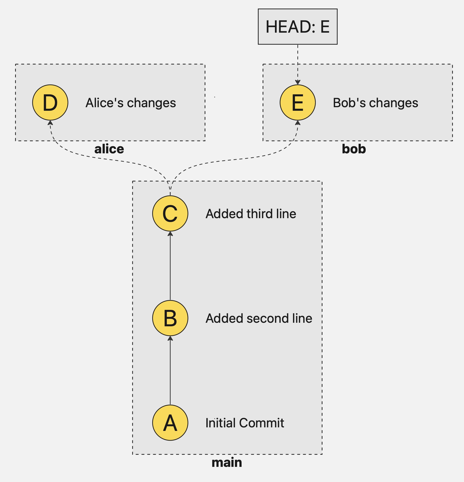 Let’s create a conflict so we can see how this looks like and how to deal with them. We’ll create two branches: alice and bob, representing two people simultaneously changing the same file.