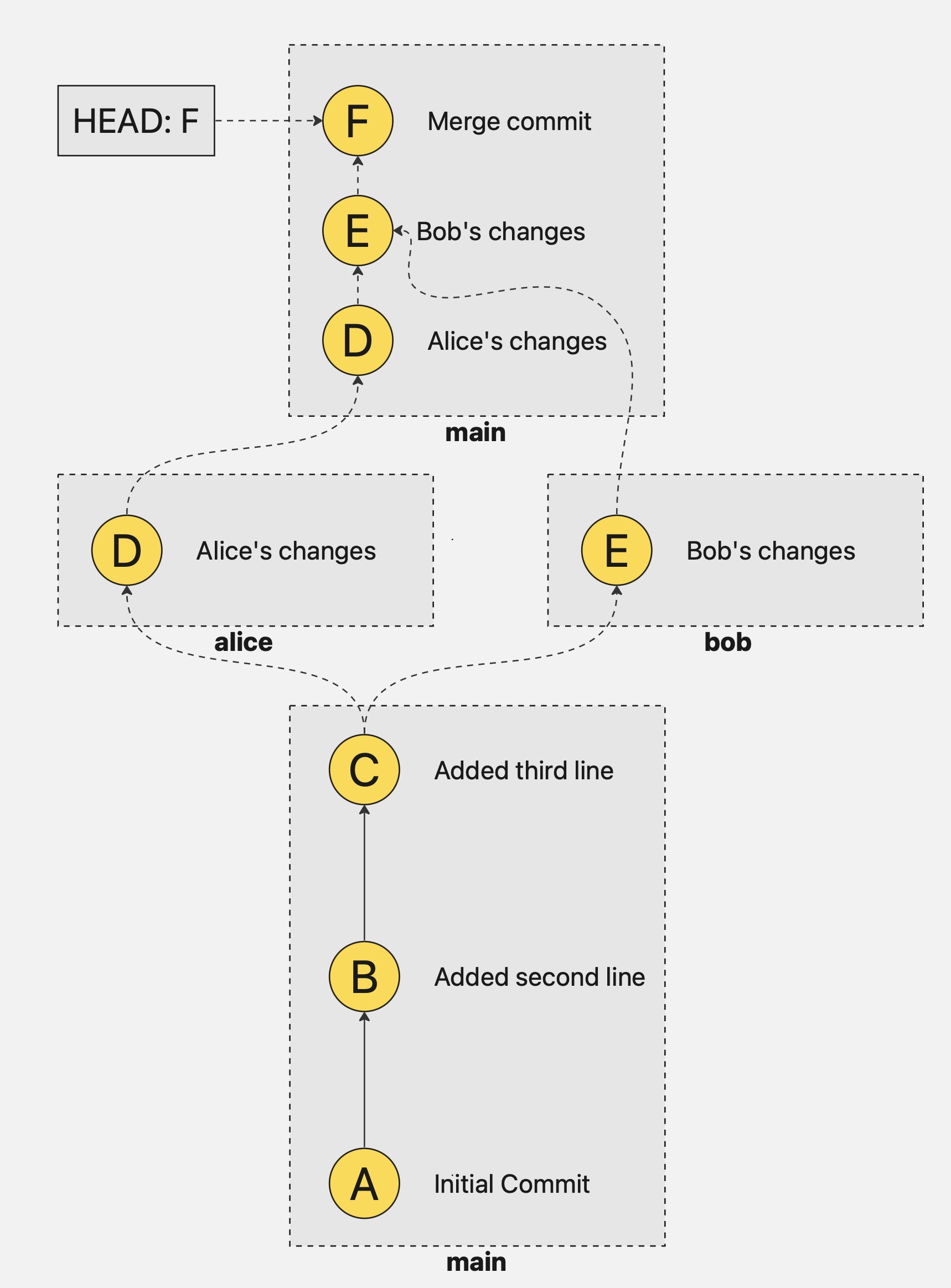Let’s see how this works in practice. We start by merging Alice’s branch first into main: