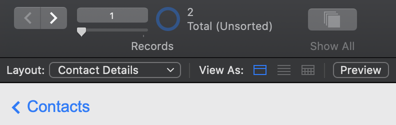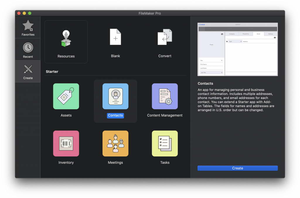 Next, let’s add our first actual layout model class. First, we’ll need a FileMaker database to connect to. For simplicity’s sake, I’ll just create a pre-built Contacts app to use as our database.