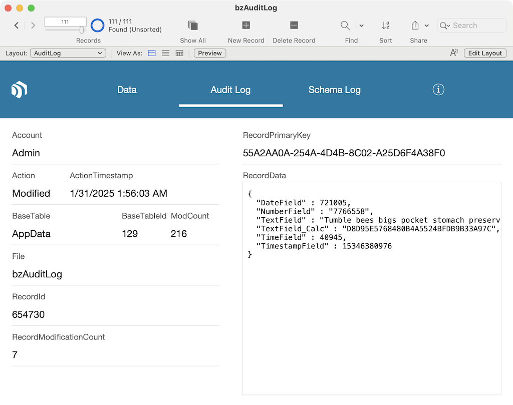 Because we are storing one change per record and have a single RecordData field in our AuditLog table, we will need a structure to store our data. It makes sense to use JSON as it’s well-supported within FileMaker and in other databases (e.g. Oracle, MySQL, PostgreSQL) and languages (e.g. JavaScript, Ruby, Python) that might consume our log. Therefore, our RecordData field will be a text field containing a JSON object. Each field of the record data will be stored in a property of the JSON object. The structure will look like this: