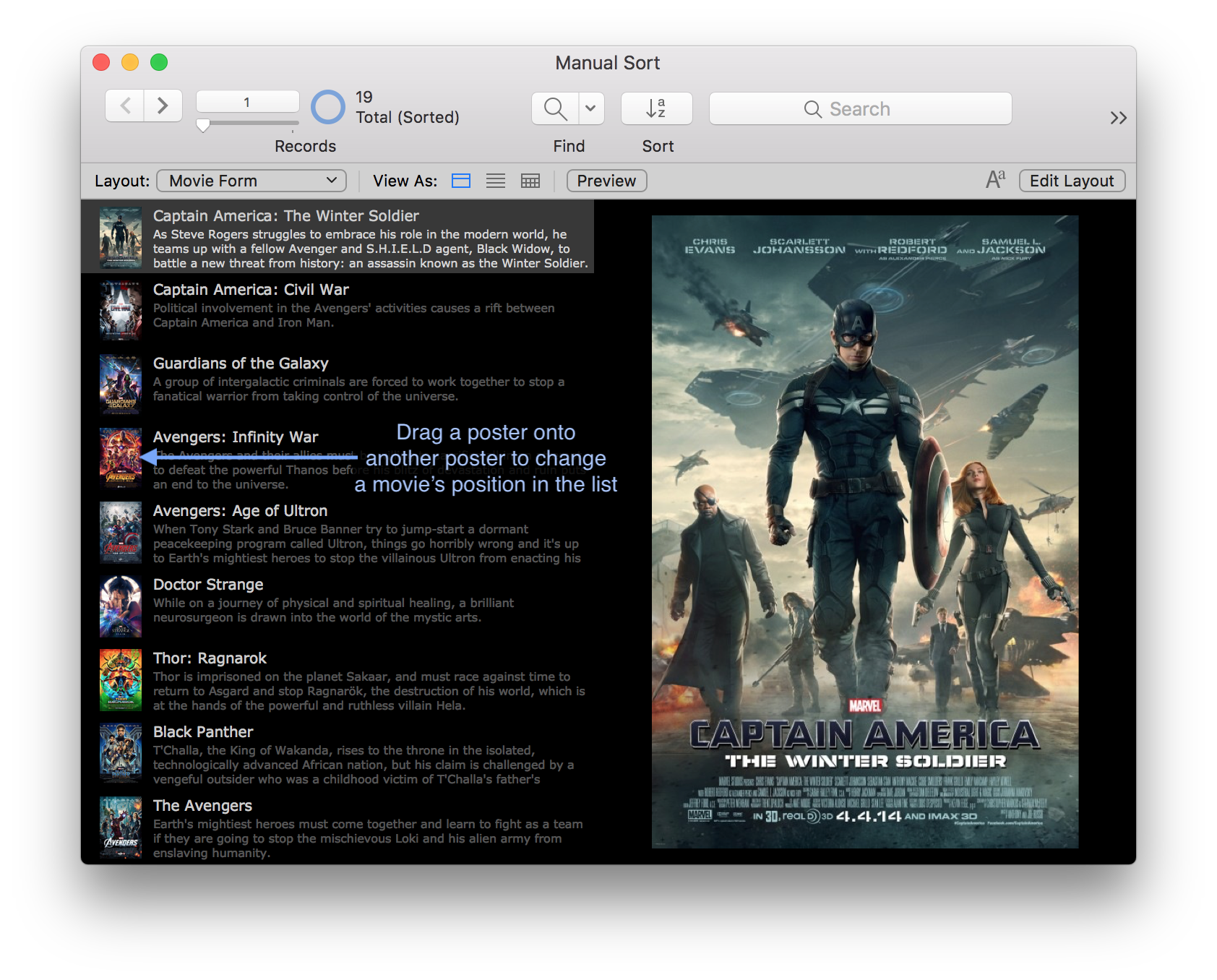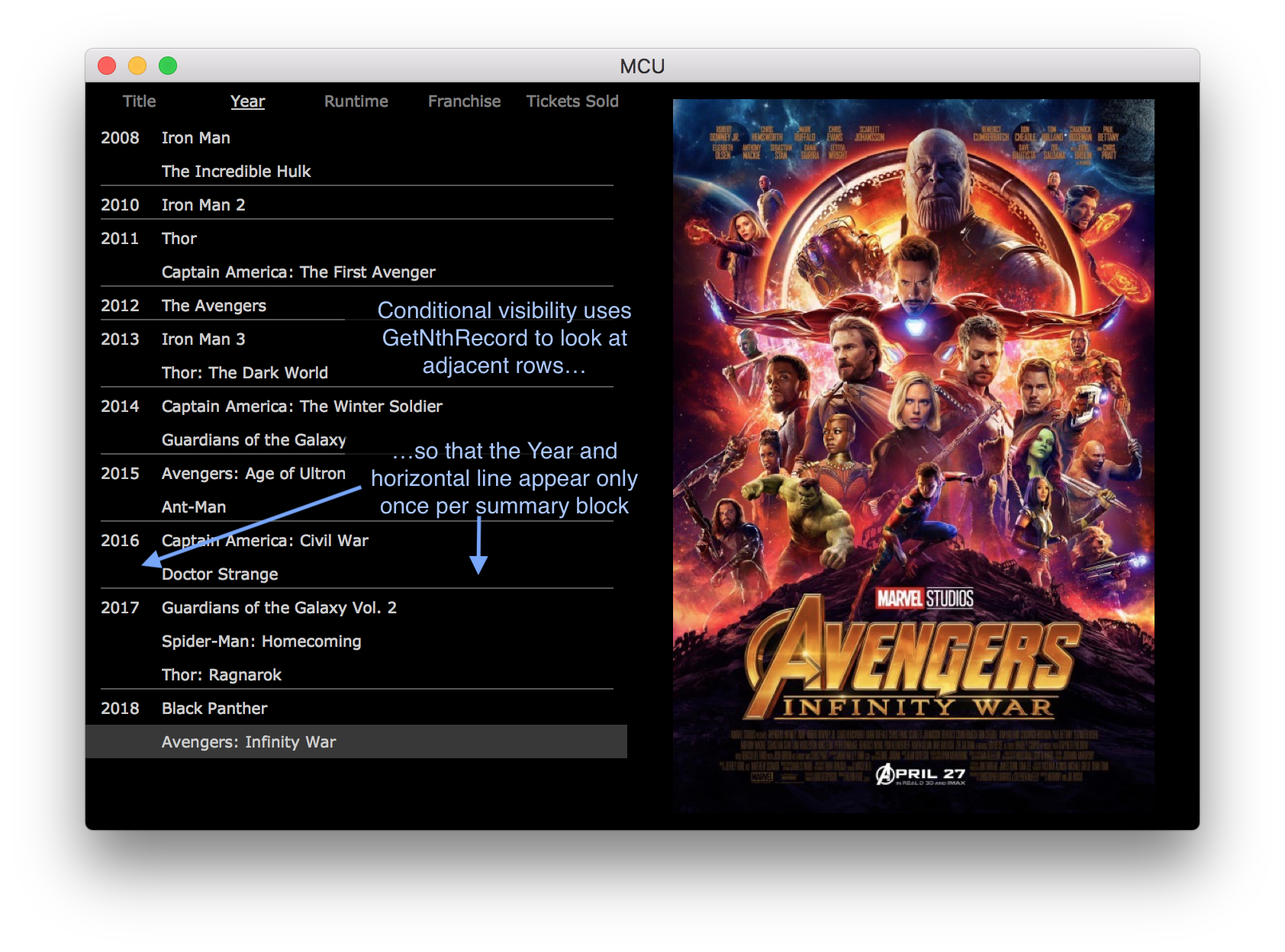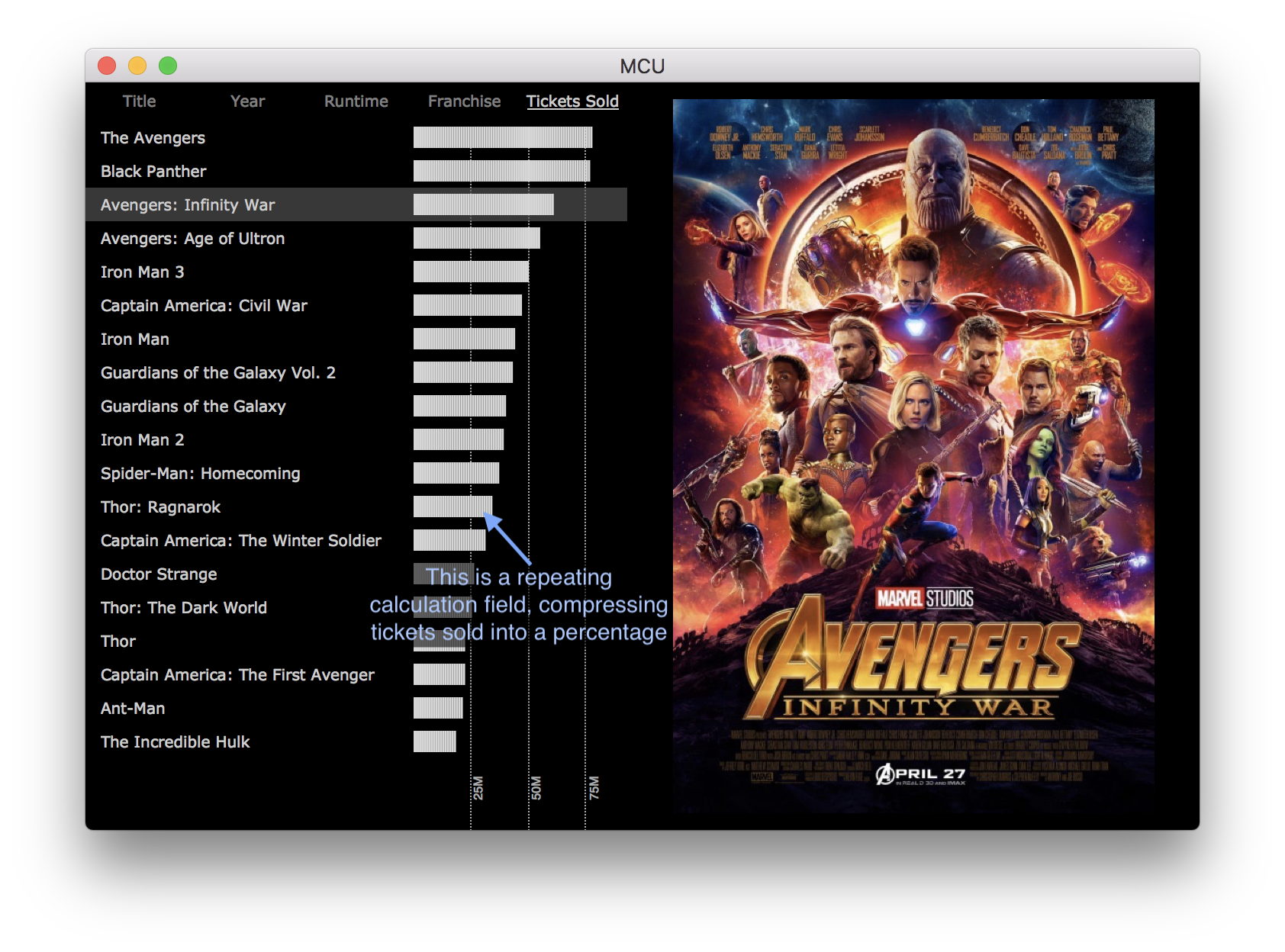 The MCU.fmp12 example demonstrates a few of the many ways a master-detail layout can help the user visualize the data in their found set. In this example a master-detail portal is placed on each of a tab control’s panels, with each panel auto-sorting the found set in a way that is meaningful for that particular portal.