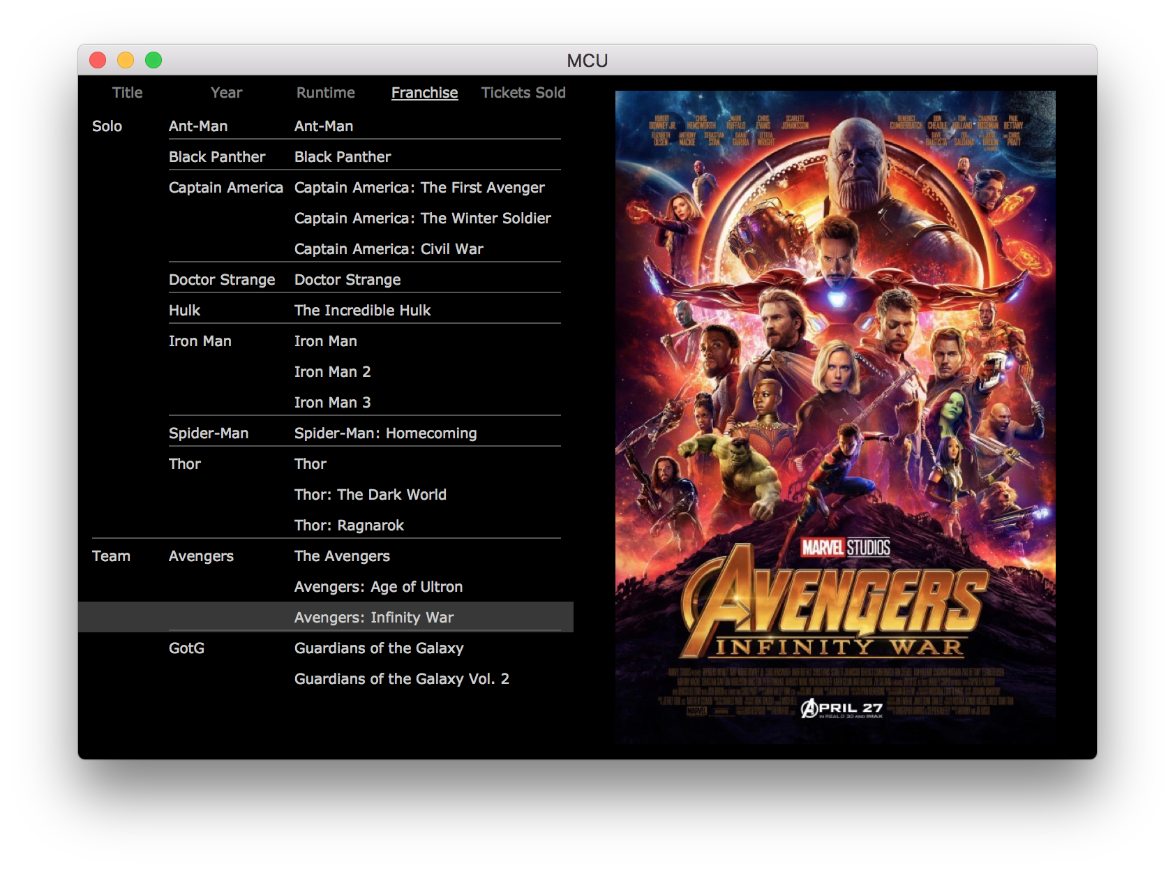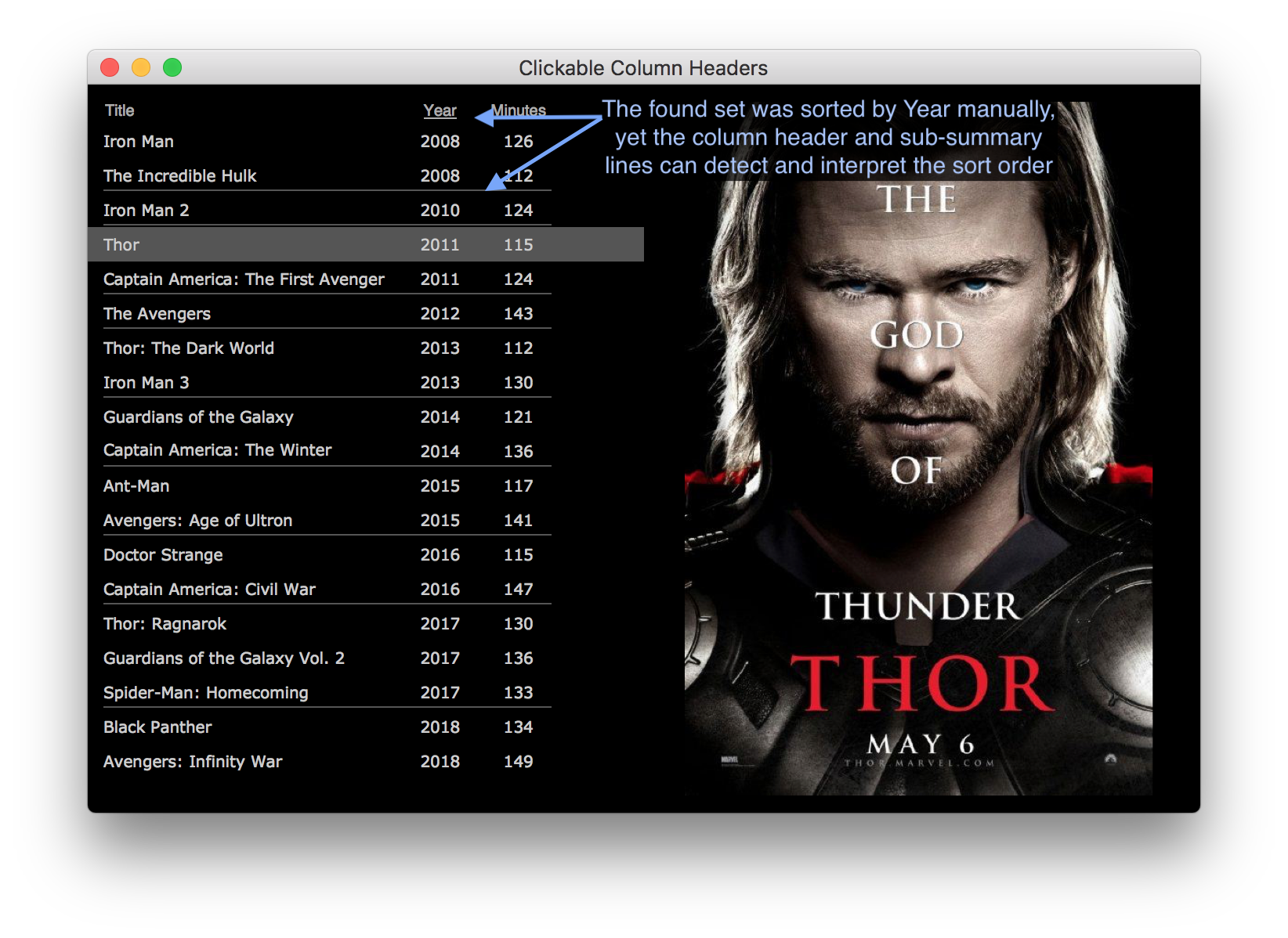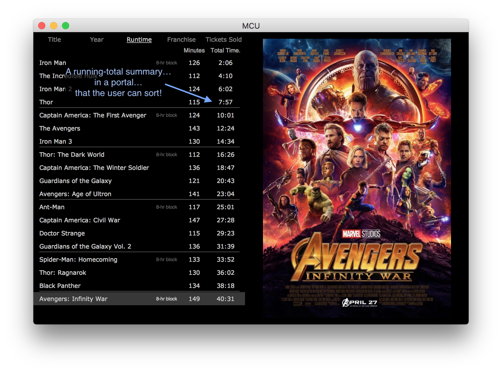The MCU.fmp12 example demonstrates a few of the many ways a master-detail layout can help the user visualize the data in their found set. In this example a master-detail portal is placed on each of a tab control’s panels, with each panel auto-sorting the found set in a way that is meaningful for that particular portal.
