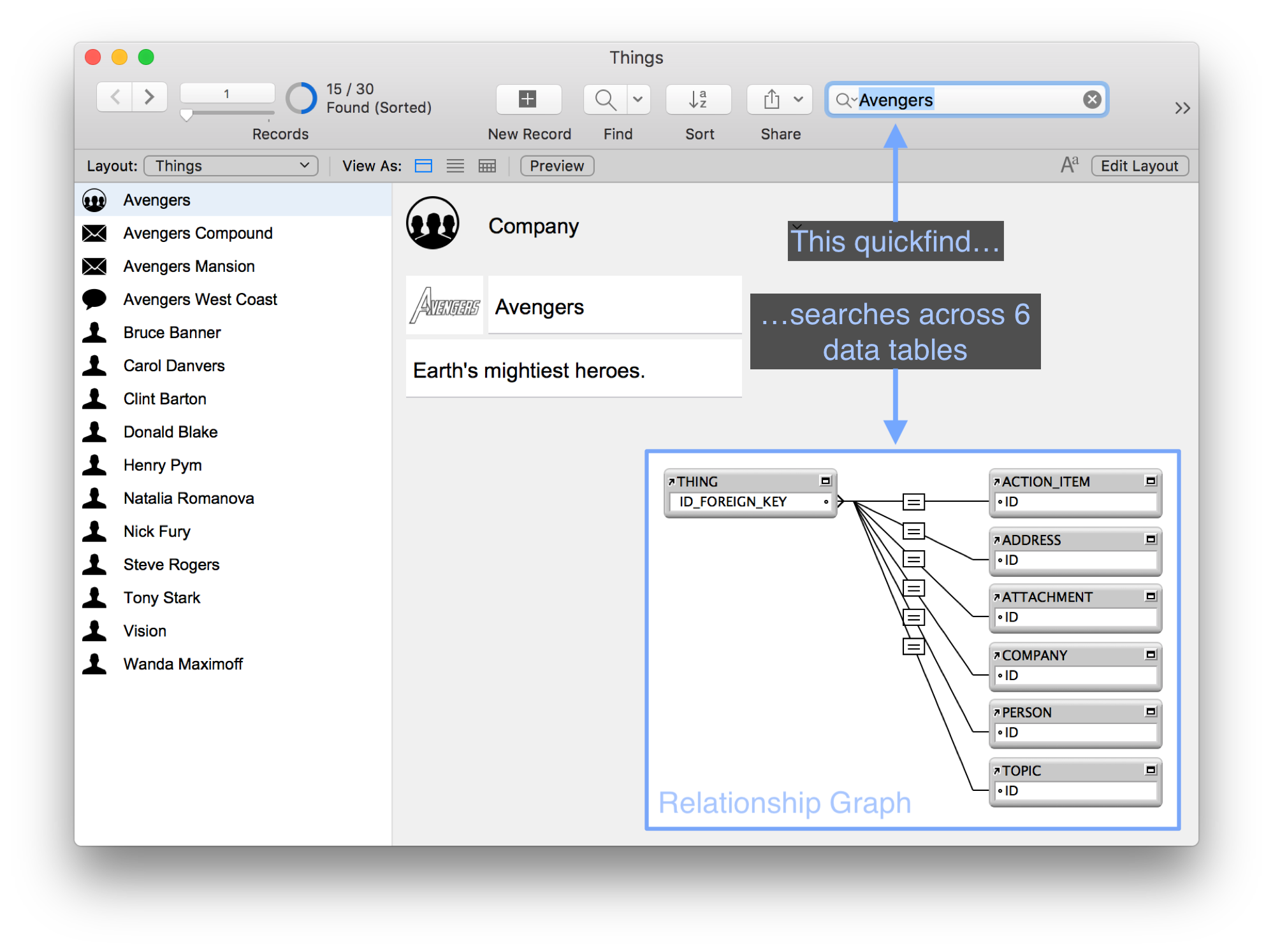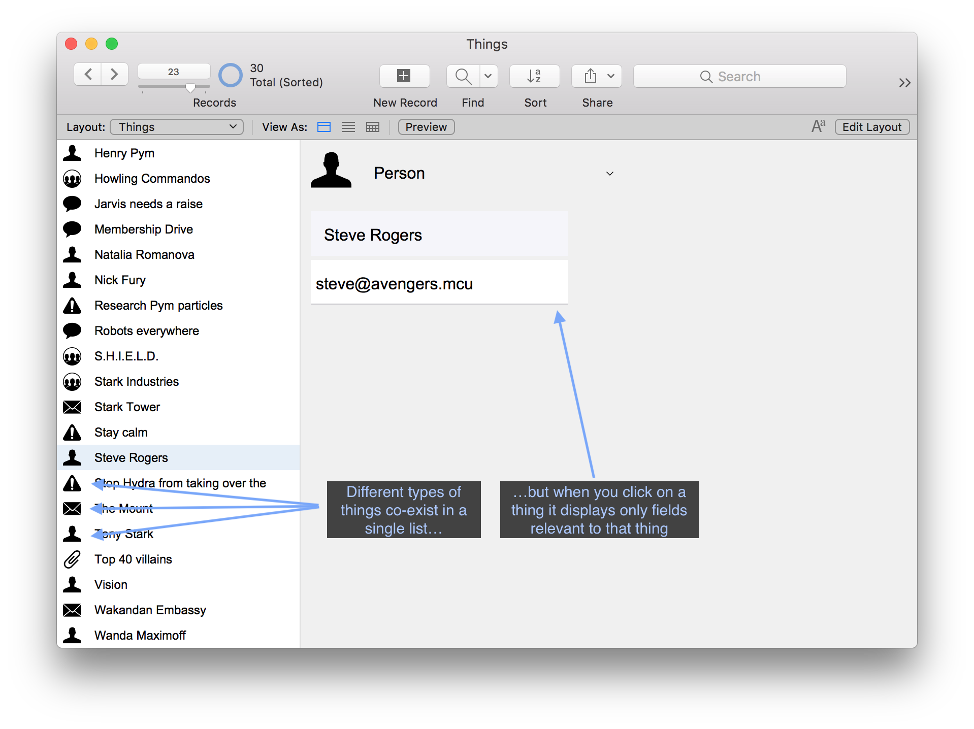 The Things.fmp12 example uses an old technique to flatten unlike objects (people, companies, attachments, addresses, action items, topics) into a single display table. The user may click a thing on the left to see that thing’s details on the right. (Thanks to conditional visibility, we see fields only from that thing’s corresponding data table.)