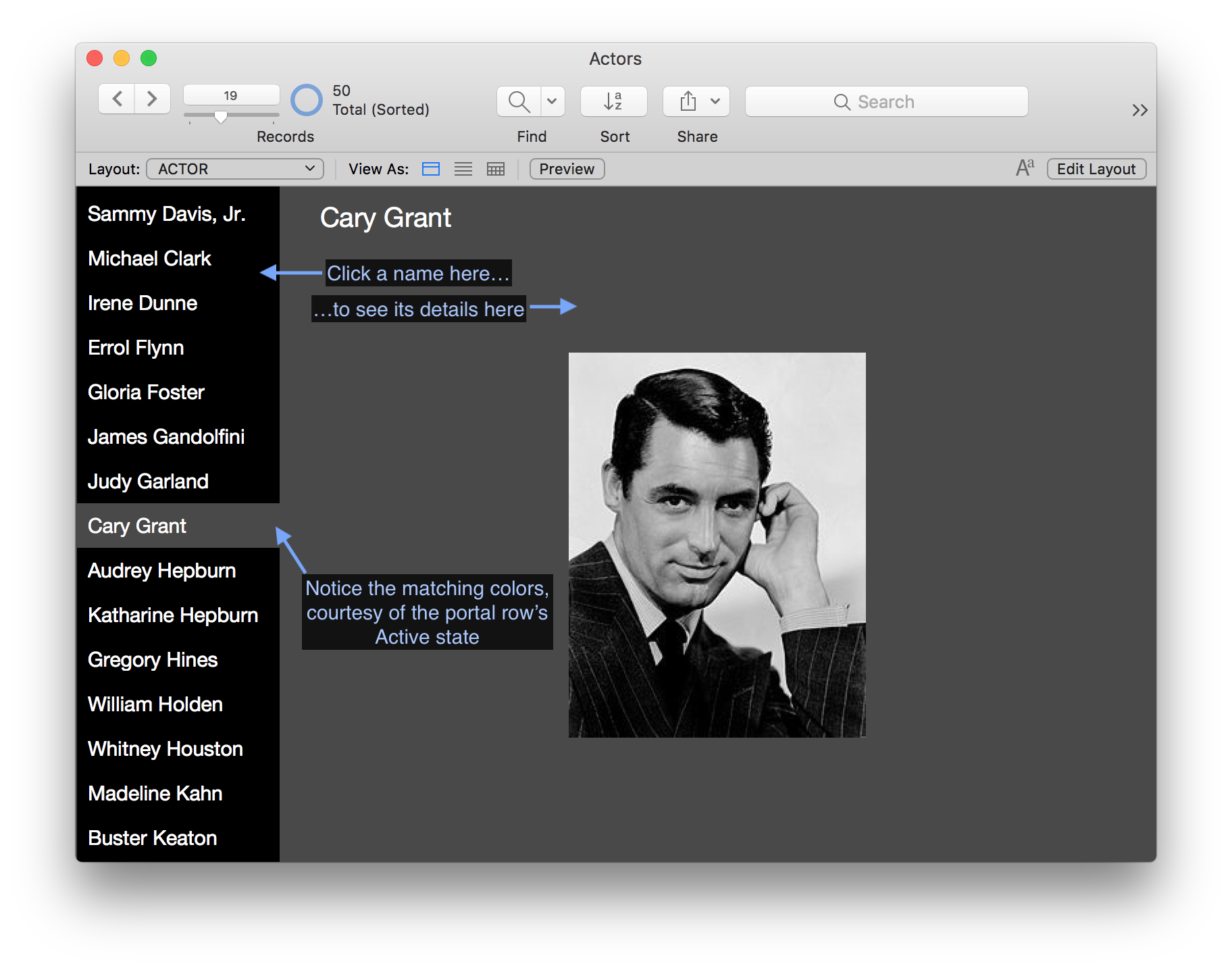 A master-detail layout displays information to the user about their found set that helps them navigate through those records. The Actors.fmp12 example shows a master-detail layout at its simplest: click on any name on the left to see the corresponding details on the right.