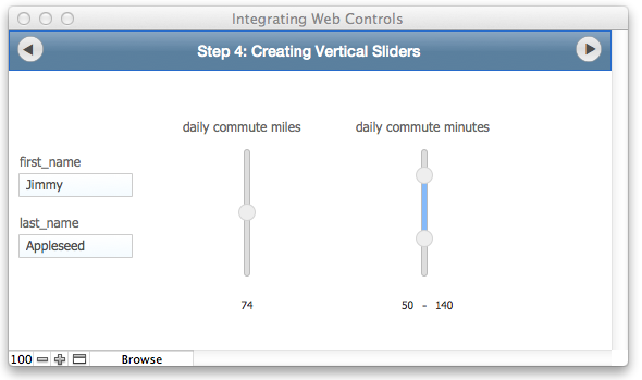 Two native web controls (a single and a dual range slider), plus several standard FileMaker edit box controls (first and last name fields, as well as live text values,) work together to create a simple interactive layout.