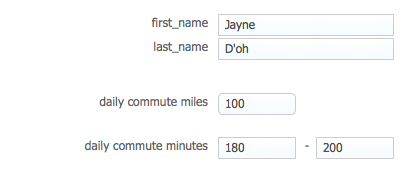 Let’s start with a simple FileMaker solution. We’ll track some very basic information about employees and their commutes: daily commute miles, and the minimum & maximum number of minutes their commute can take (say, depending on traffic conditions). Here’s our FileMaker Pro 12 layout using standard native controls: