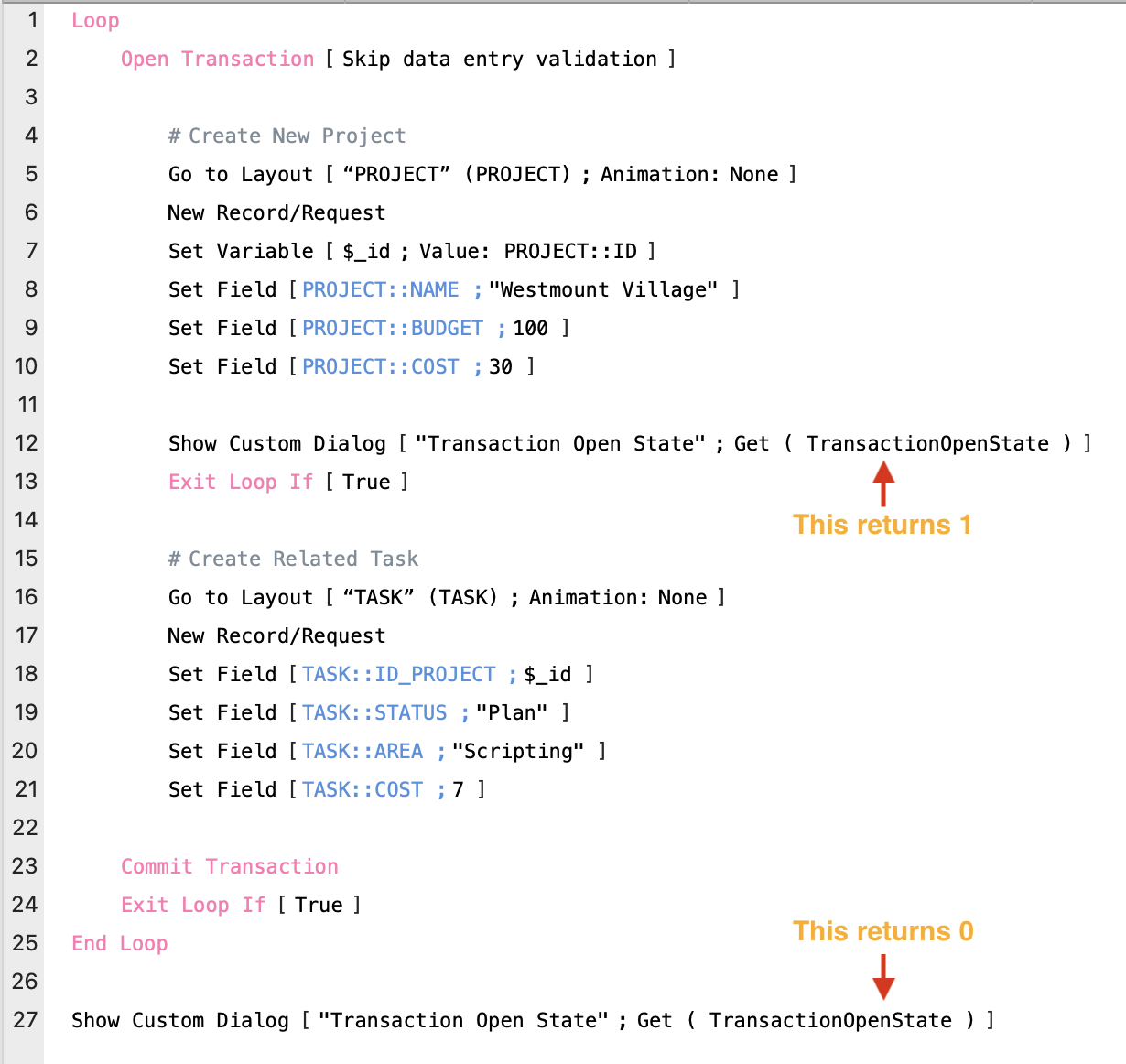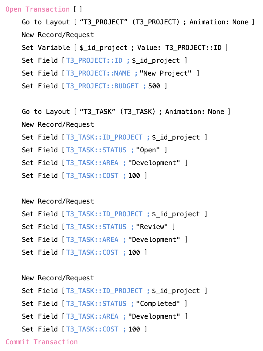 Note: FileMaker won’t let you save a script where you have nested transactions. This is something you can do with If and loops but not something you can do with transactions steps.