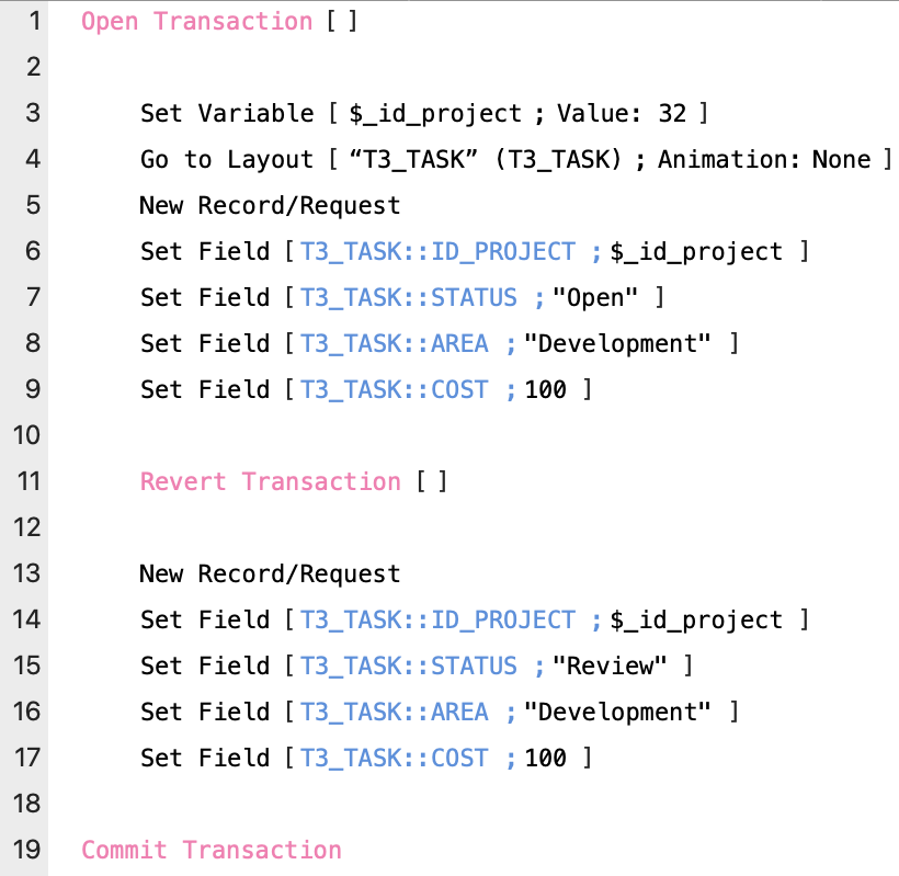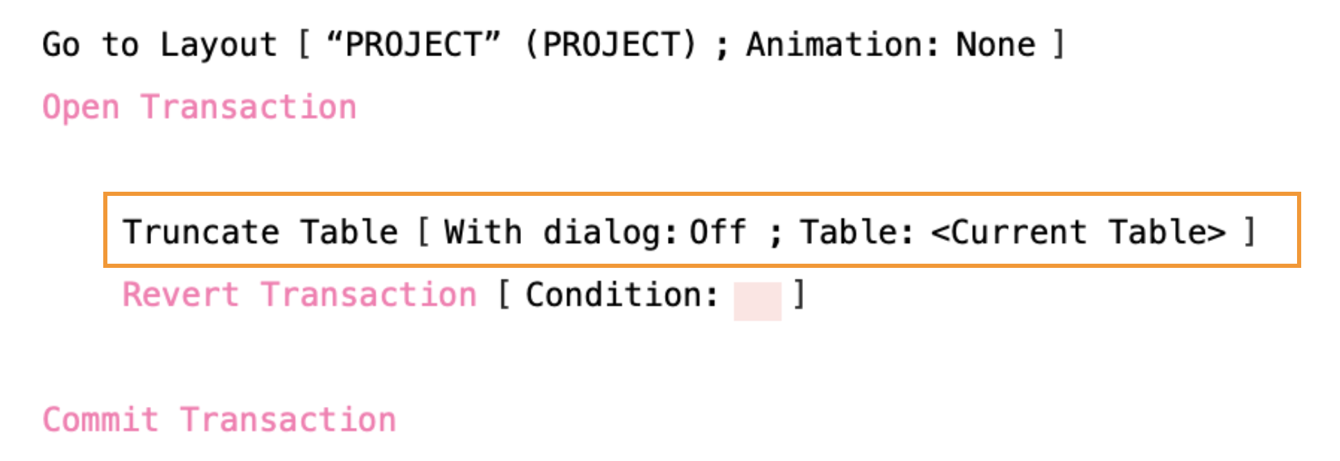 You’ll notice as in the image that Open Transaction and Commit Transaction will nest ➡️ the content just like If/End If and Loop/End Loop. The section that starts with Open Transaction [ ] and ends with Commit Transaction [ ] I’ll refer to this as the transaction block.