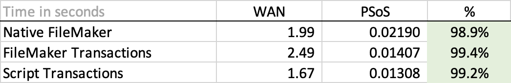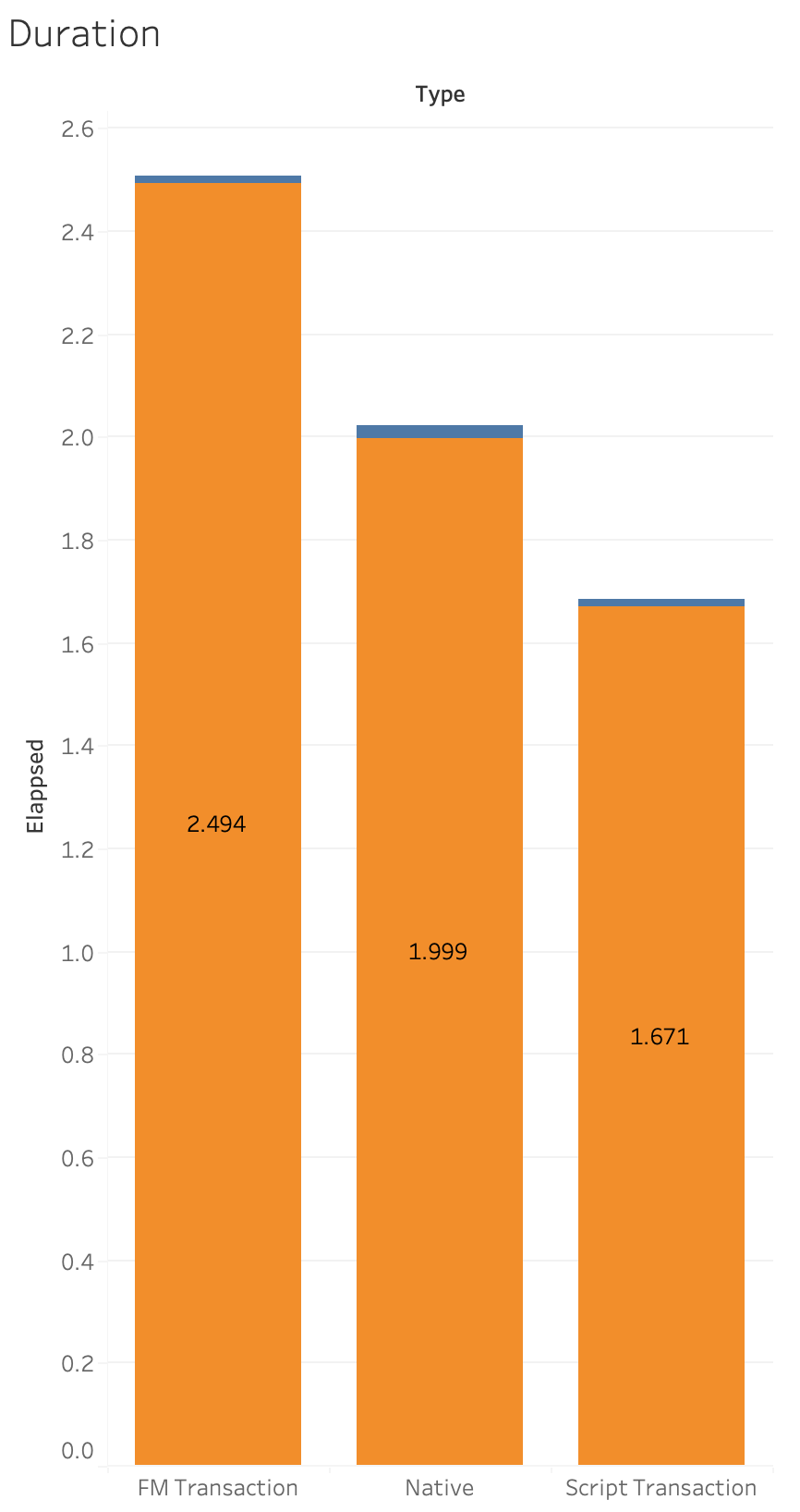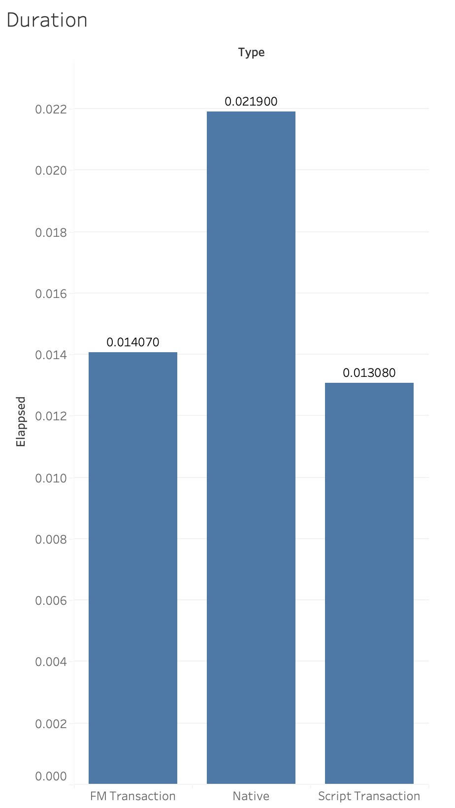 Next, let’s look at the performance difference of using native FileMaker operations vs the (pre-v19.6) FileMaker transactions that we have been using for so many years and compare that to the new script transactions.