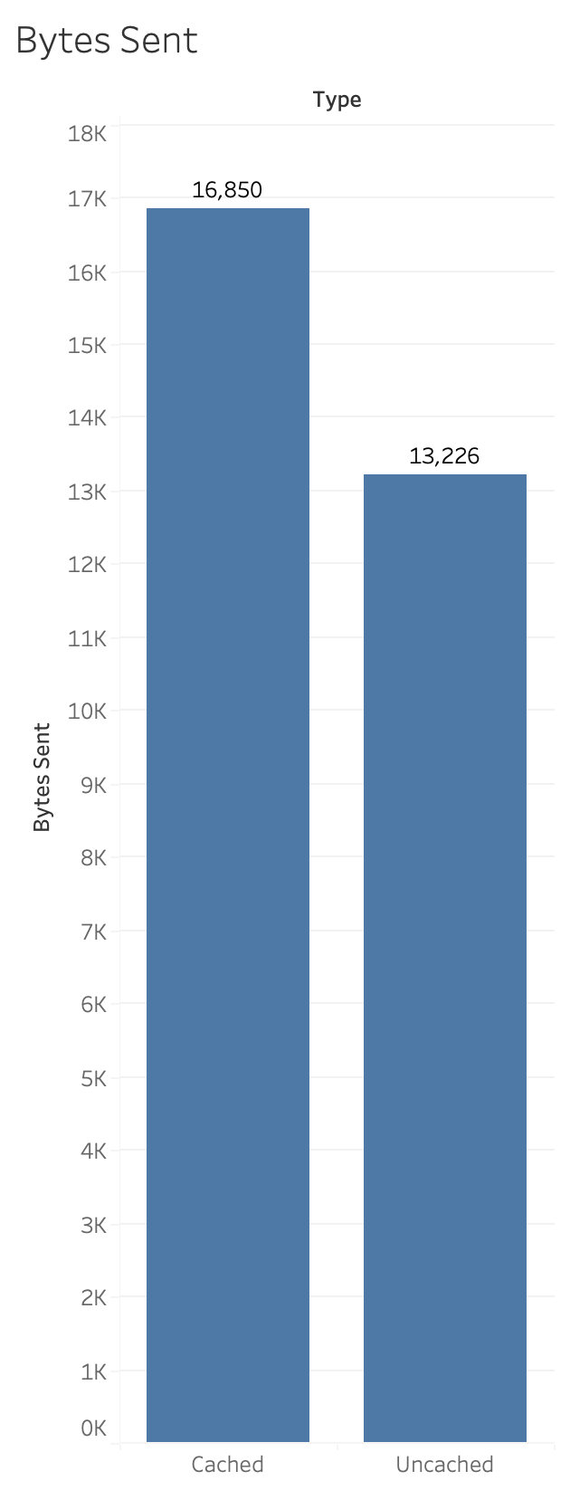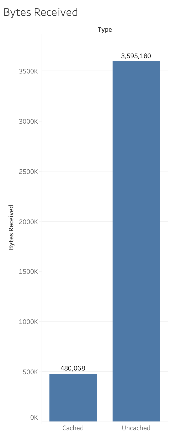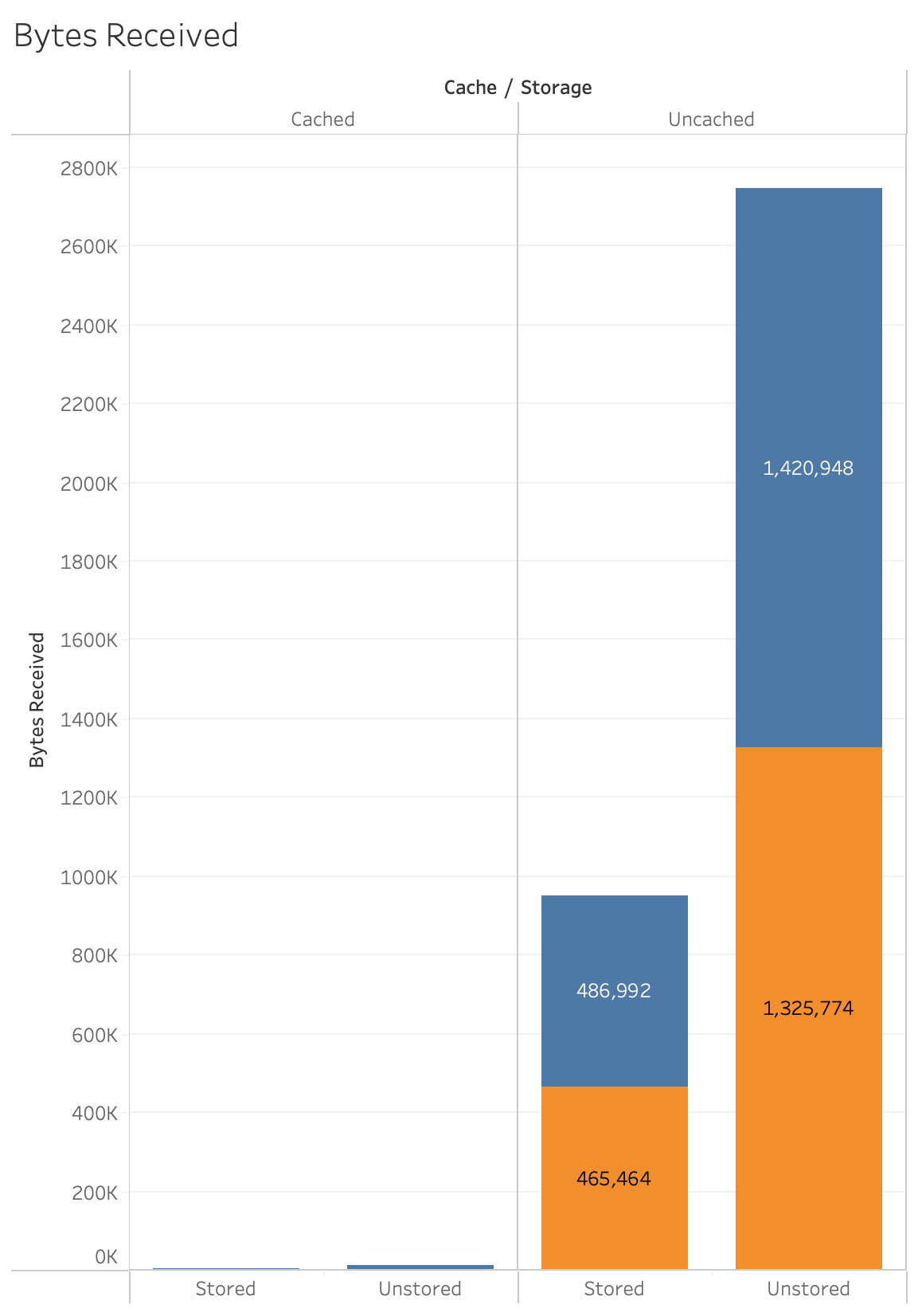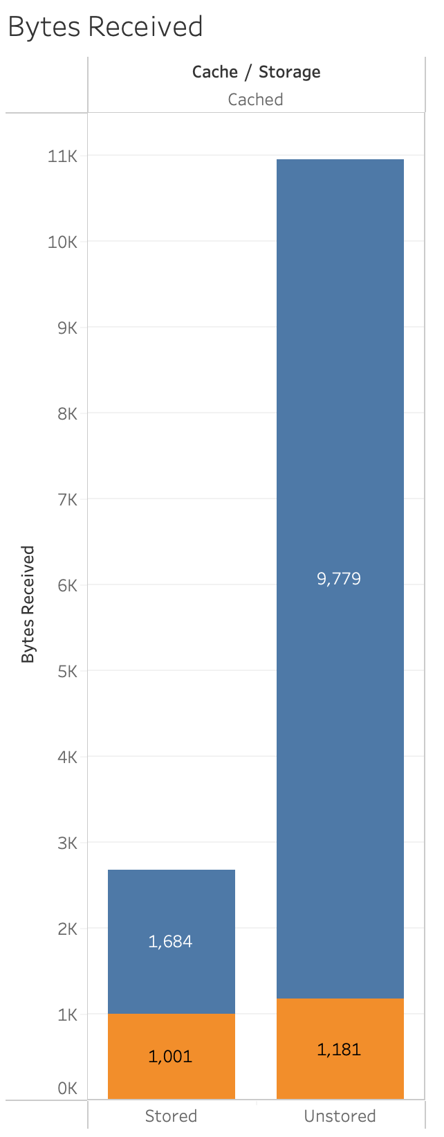 In this chart we see the impact that the stored values have on the amount of data sent to the client. Notice the dramatic difference in the amount of data when the cache kicks in. In the next chart we’ll filter out the uncached values so we can see more closely the bytes received.