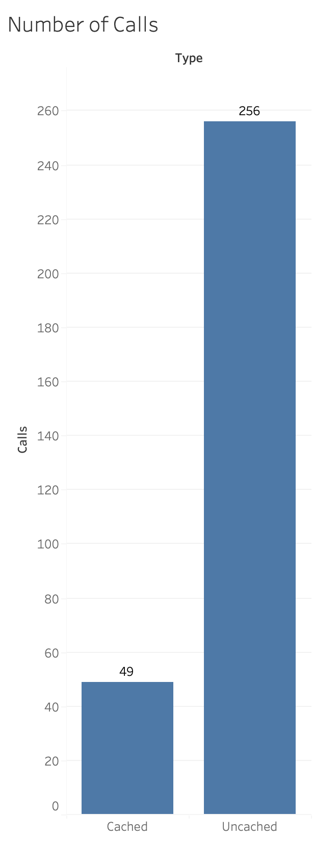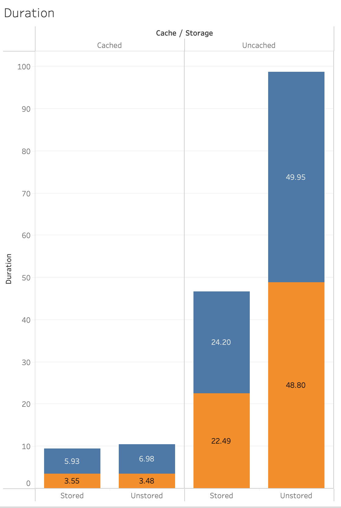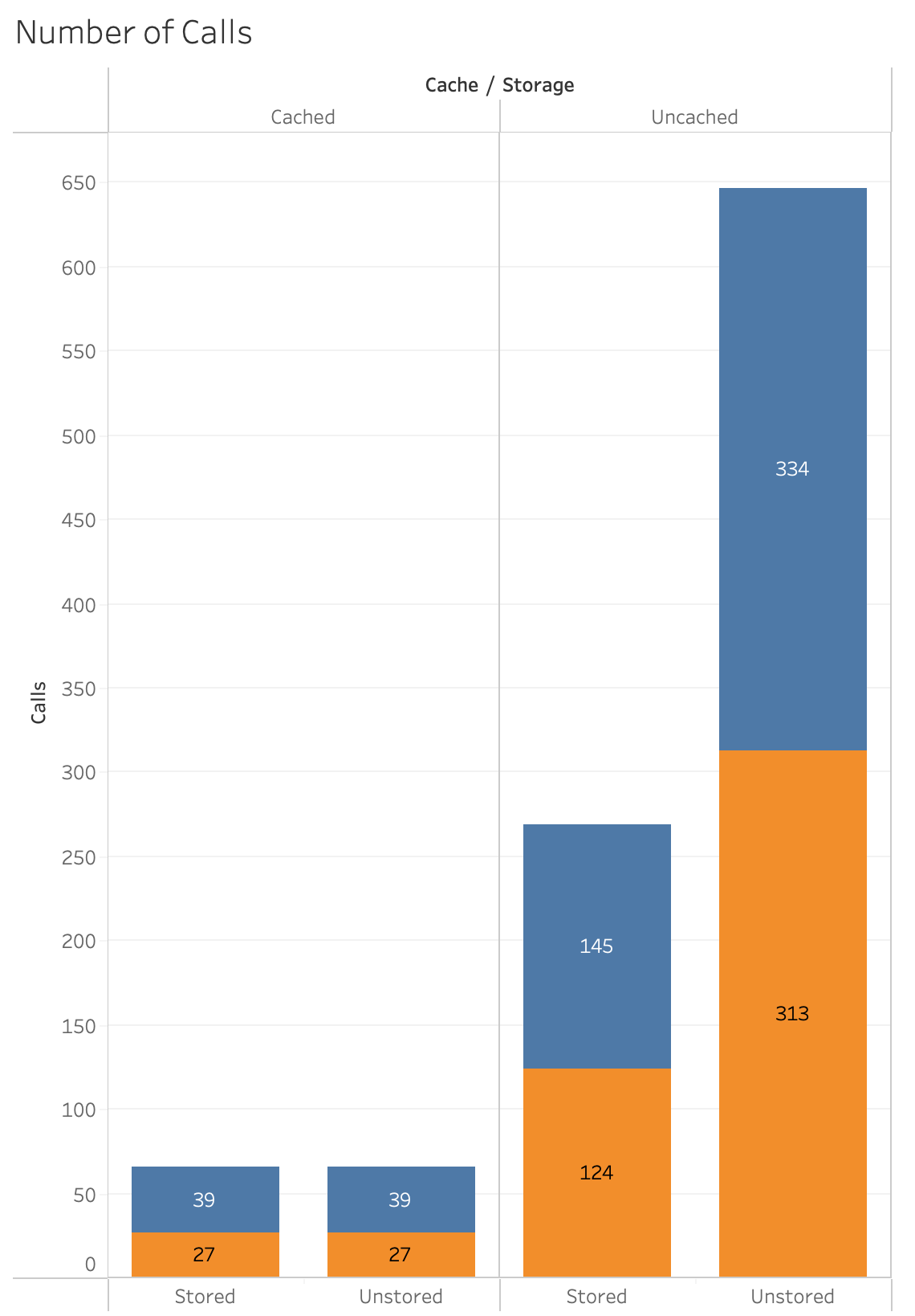 In this chart we see the impact that the stored values have on the amount of data sent to the client. Notice the dramatic difference in the amount of data when the cache kicks in. In the next chart we’ll filter out the uncached values so we can see more closely the bytes received.