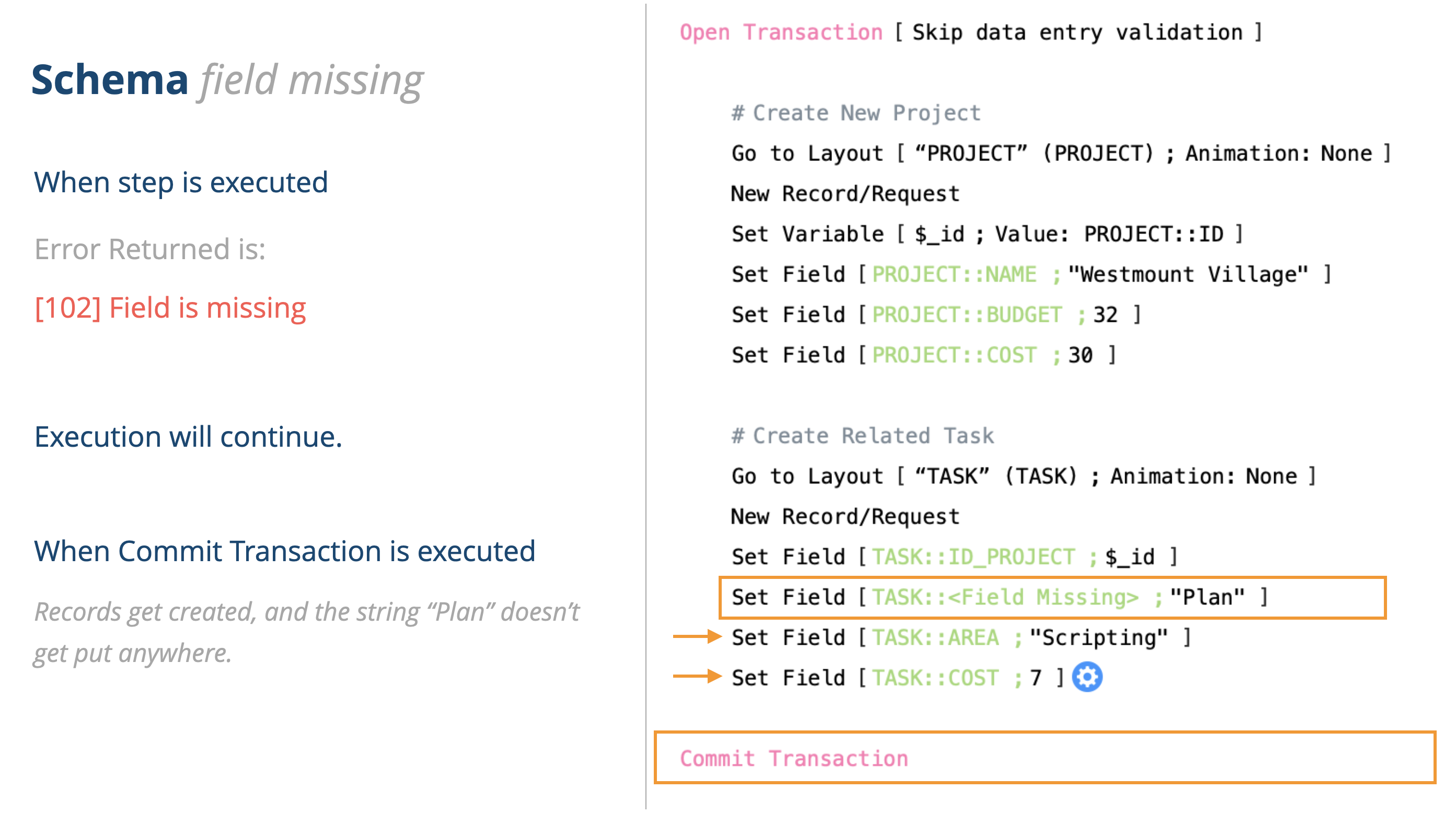 There are situations like this (taken from my slide deck about script transactions)… where you have schema problems with your solution. This broken reference to a field isn’t going to prevent your script from executing. It will actually execute and work … it just won’t auto-abort. But the word “Plan” doesn’t get placed anywhere.