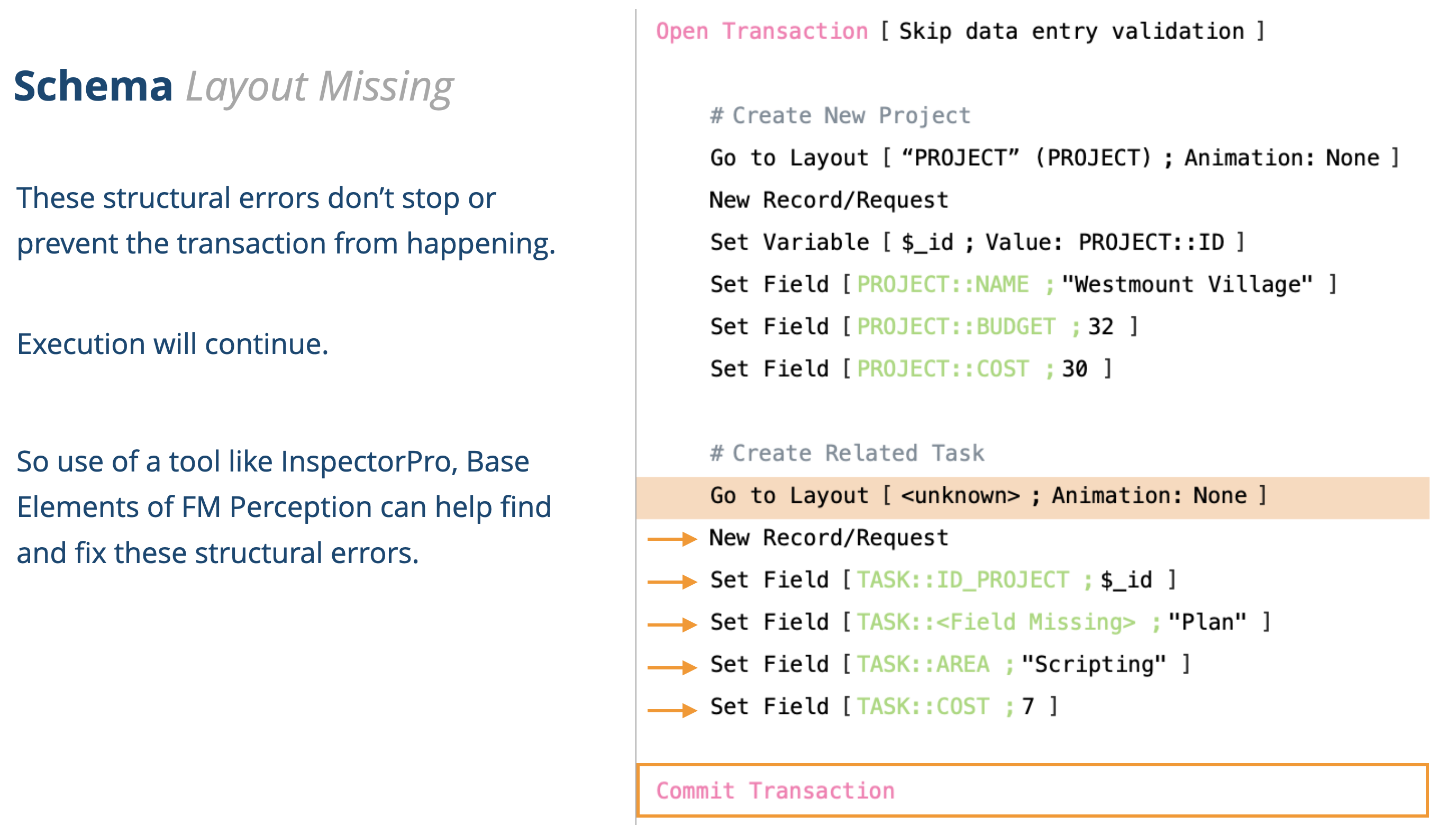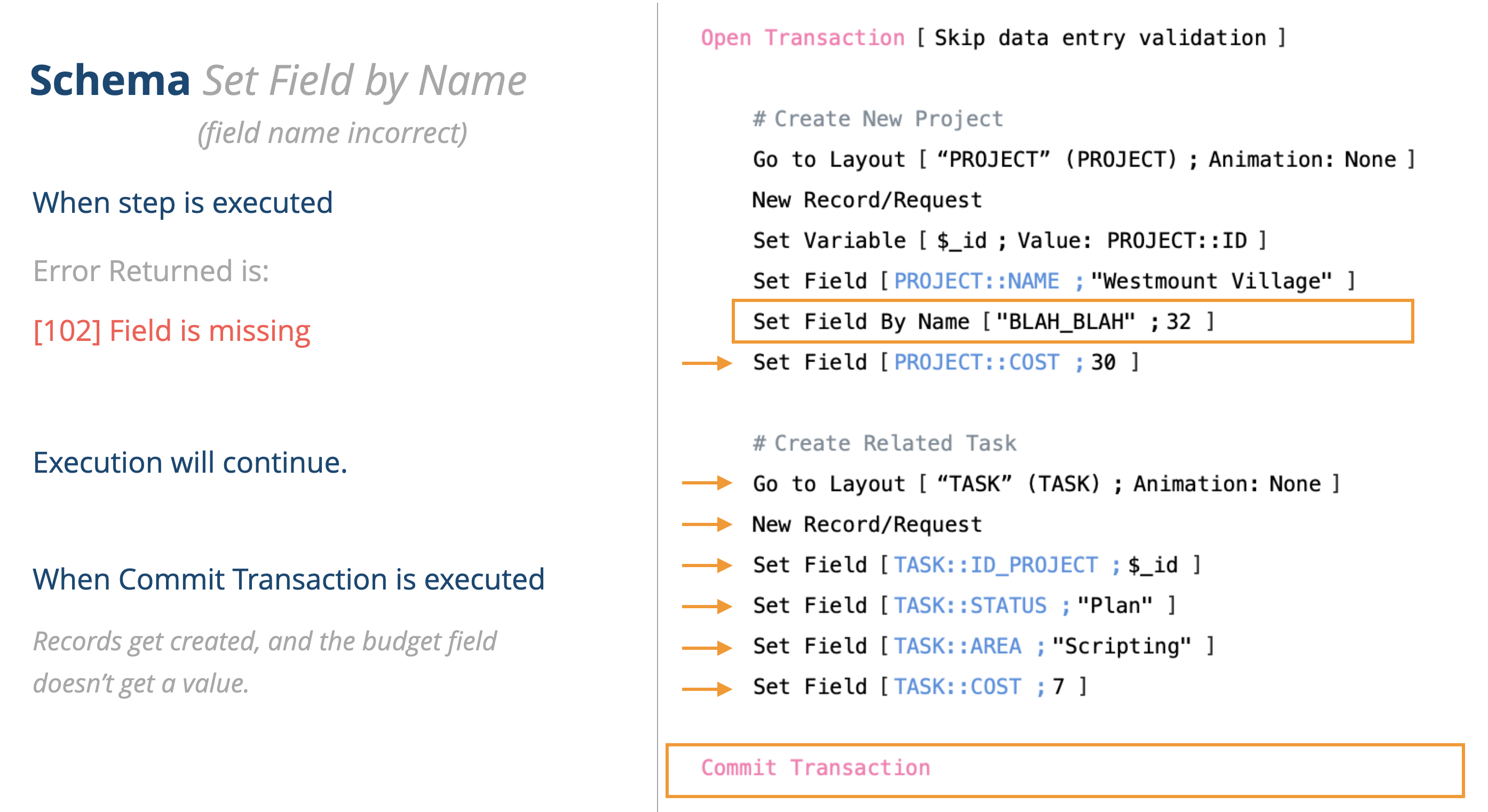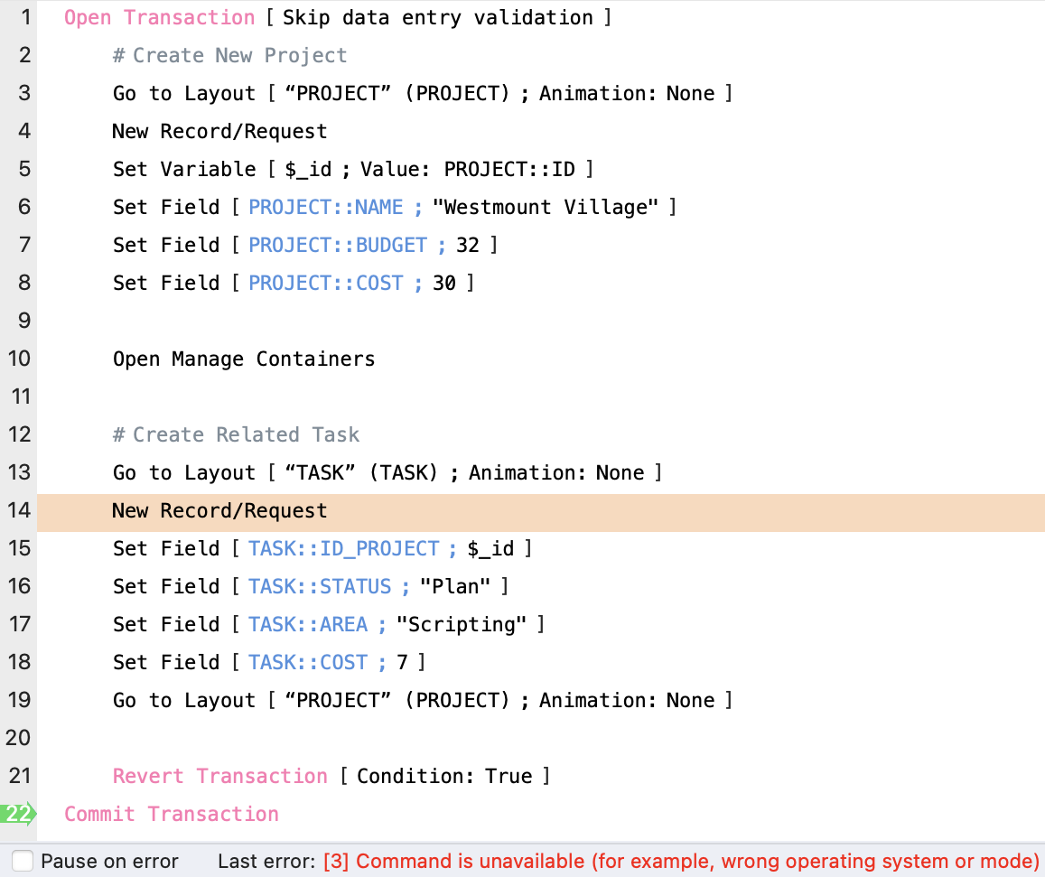 Here is another schema error. Yet again, the transaction will plow right through in this case. I believe you’ll end up with two Project records… just because by going to a layout that doesn’t exist, basically it won’t take you anywhere.