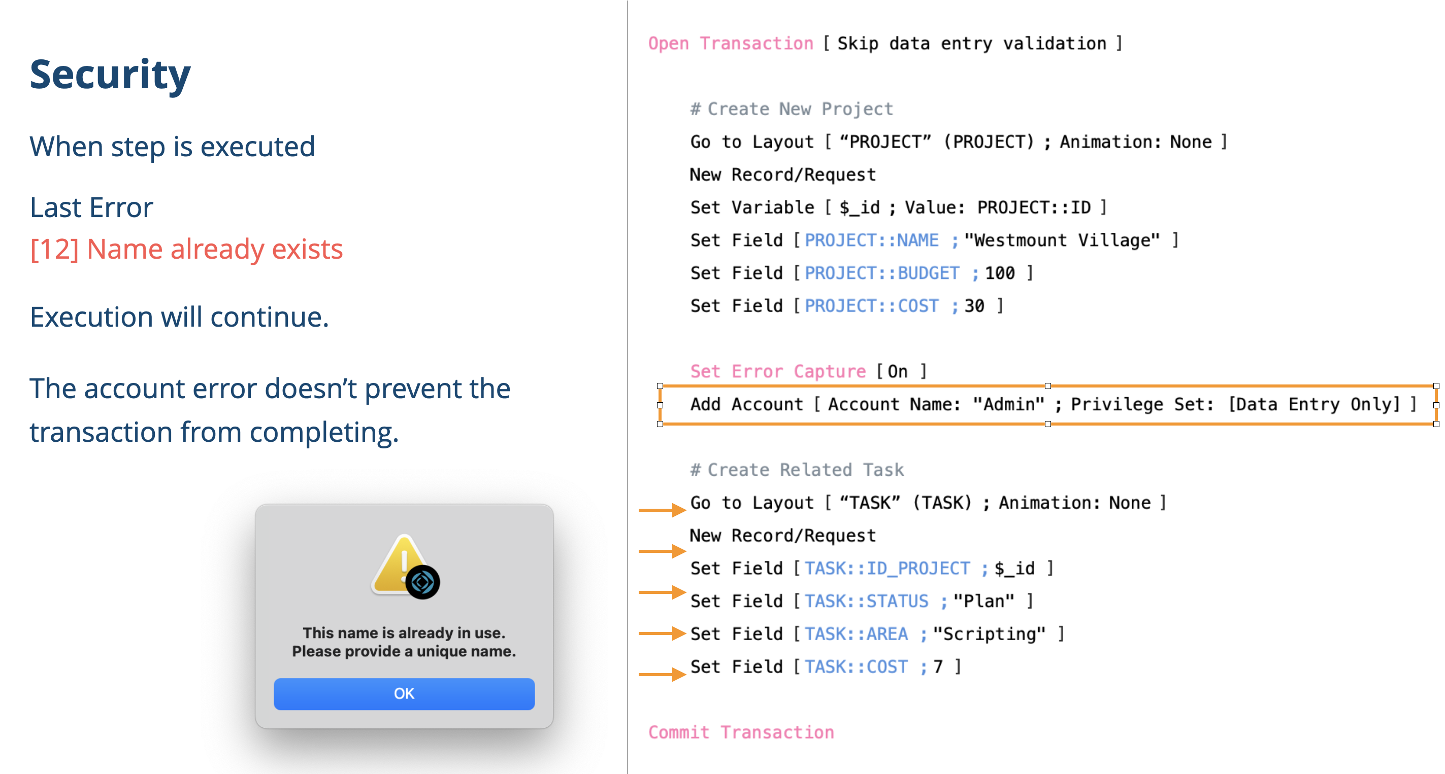 This last example shows where, as part of the transaction block, you want to also be creating an account. Again, the transaction isn’t affected by the fact that an account failed to be created.