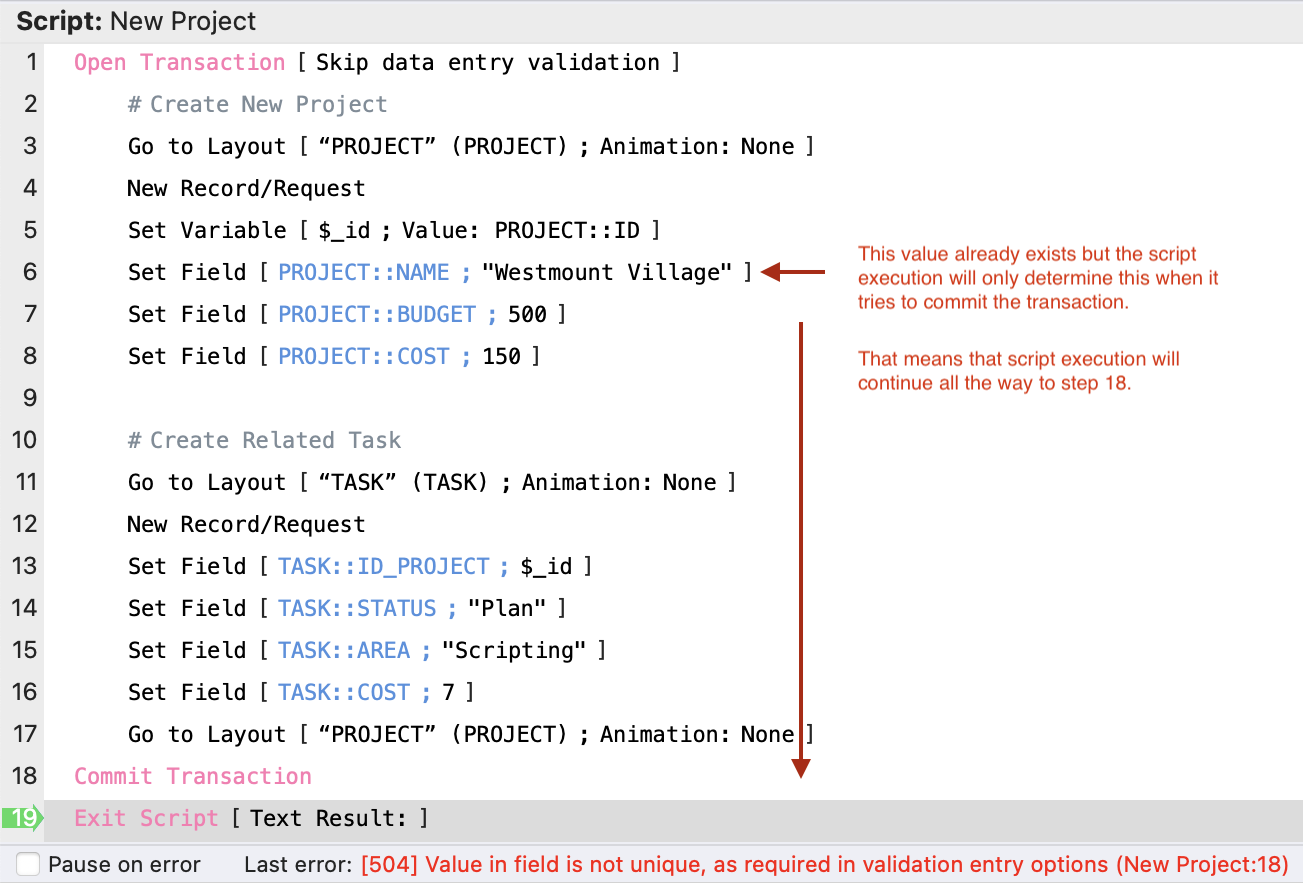On the other hand, it’s different if validation is based on the PROJECT::NAME field needing to be unique. It can only determine if this value is unique when it tries to commit the transaction. In the example below, even though “Westmount Village” exists on another record, the script will continue to execute until step 18: Commit Transaction.