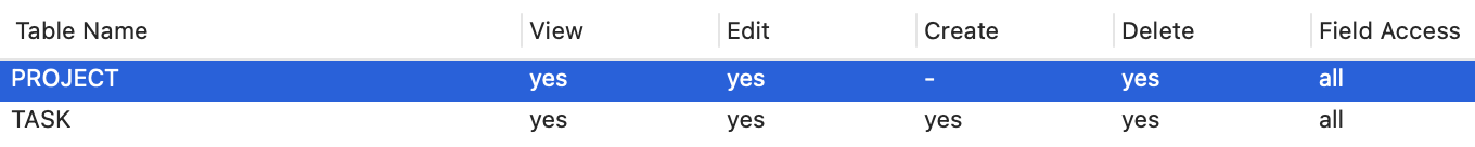Let’s say we don’t allow a user to Create records in the PROJECT table.