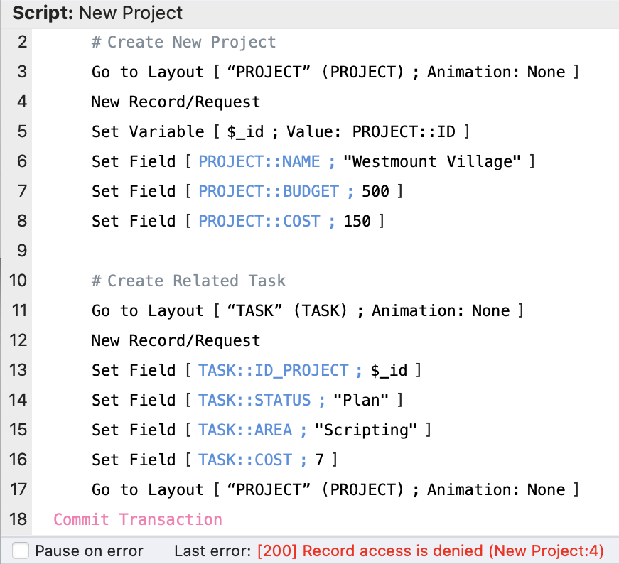 In the context of this script, we’ll see that as soon as it tries to create a new PROJECT record it will then auto-abort and jump to the Commit Transaction step, then returns the error: