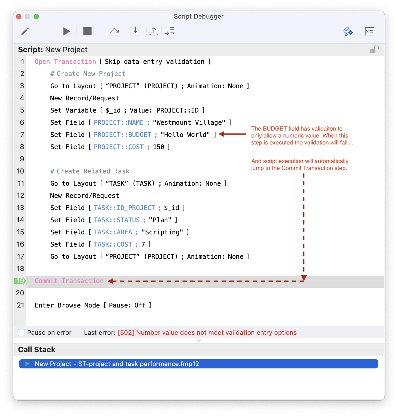 When the Commit Transaction step is executed it will return the same validation error, except it will also append to the end of the error: (<script name>:<step number>). So in this example if the script was called “New Project”, then error string returned in the debugger would be: