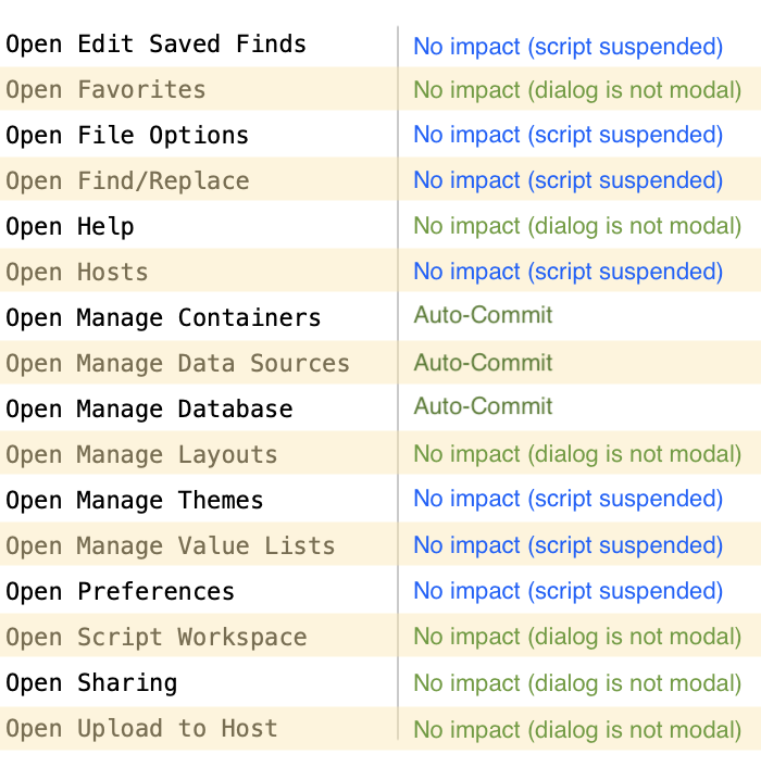 For example calling Open Manage Layouts has no impact on the running of your script as the dialog is not a modal dialog. However executing an Open File Options script step will cause your script to be suspended while the dialog is in the foreground. This dialog is a modal dialog.