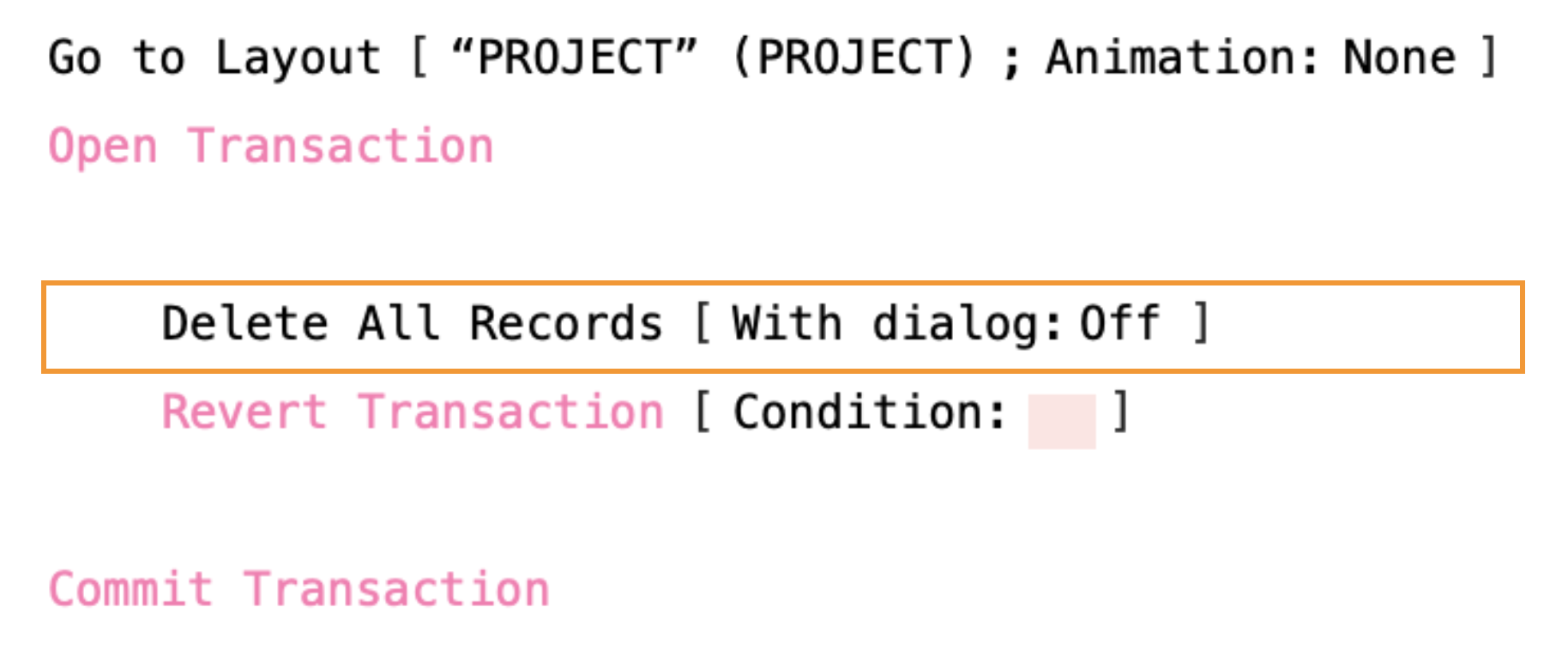 It’s worth noting that if there are a significant number of records, then this could be slower than using it outside a transaction block. That’s because Delete All Records will be deleting records in a loop, in the unlikely event that you decide to revert. It then has to brings those records back to life again!