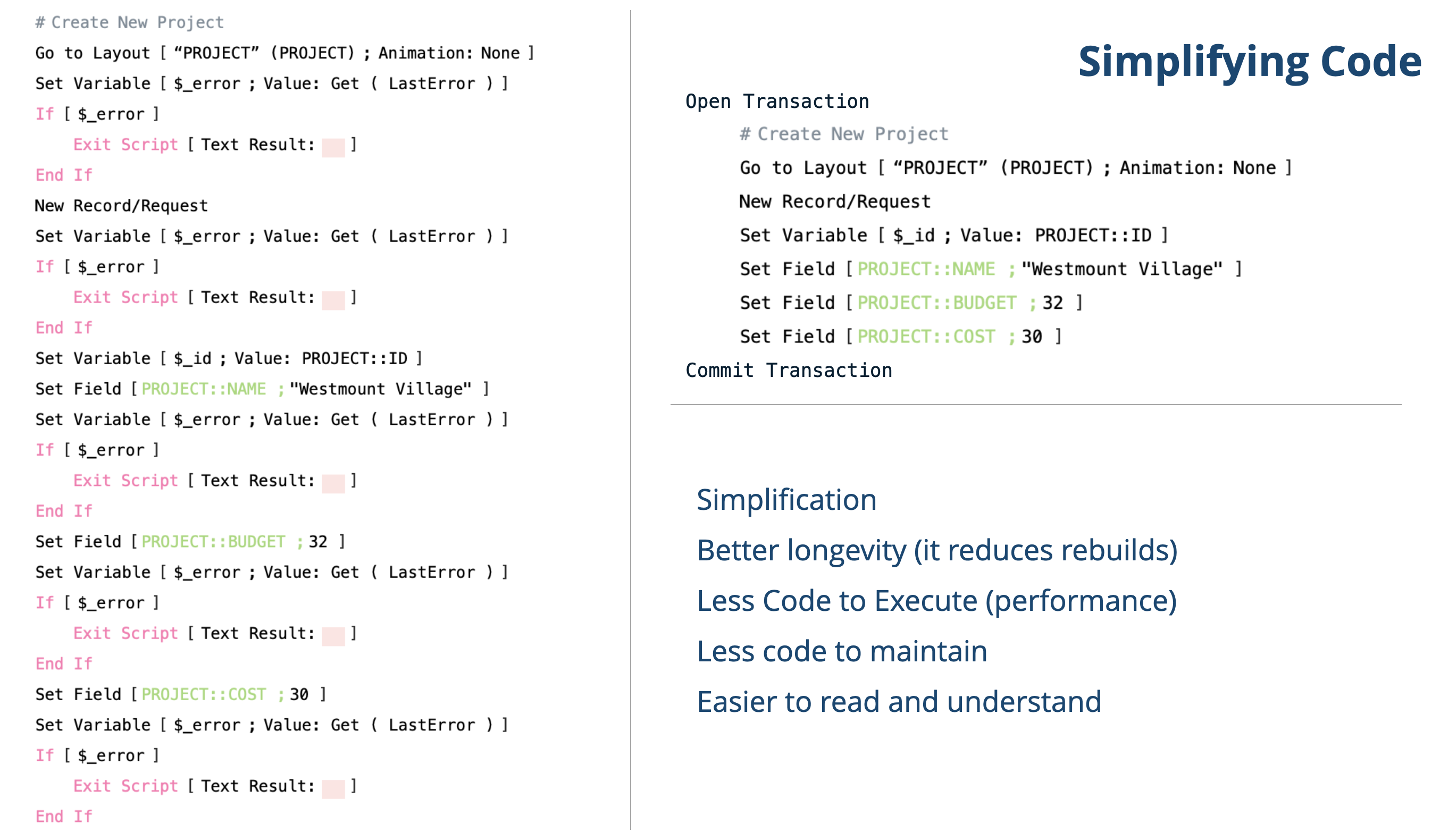 I am super excited that script transactions are finally here in Claris FileMaker. I think they will have a huge impact on how we architect our solutions. The two main benefits I see are simplified code that is easier to maintain and faster to load, and the possibility of building solutions that allow you to move away from unstored calculations.